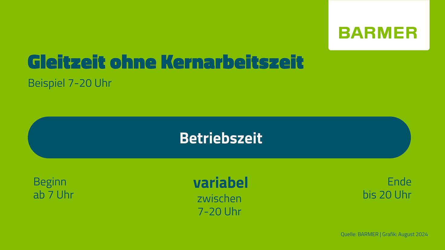 Beim Gleitzeitmodell ohne Kernarbeitszeit können Beschäftigte weitgehend frei über Arbeitsbeginn und -ende im Rahmen der Betriebszeit, z. B. von 7-20 Uhr, entscheiden.