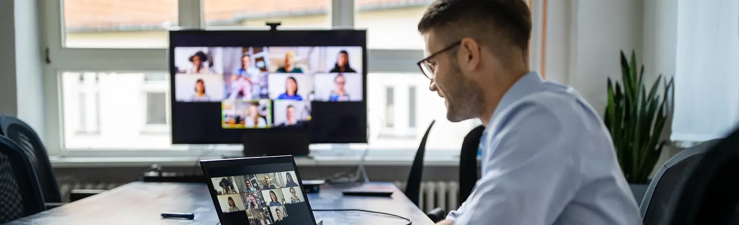 Ein junger Mann am Schreibtisch in einer Videokonferenz
