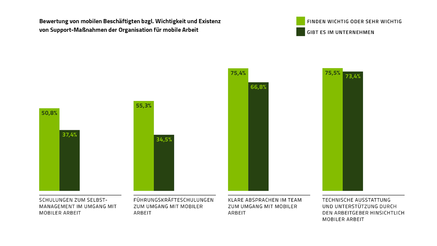 Bewertung von mobil Beschäftigten bezüglich Wichtigkeit und Existenz von Support-Maßnahmen.