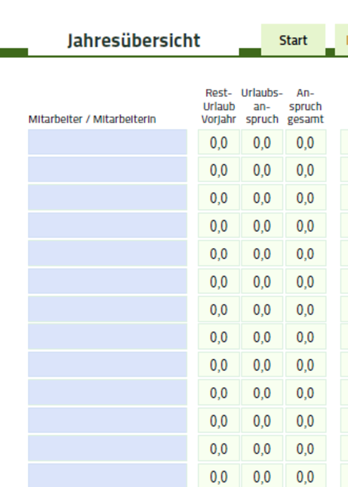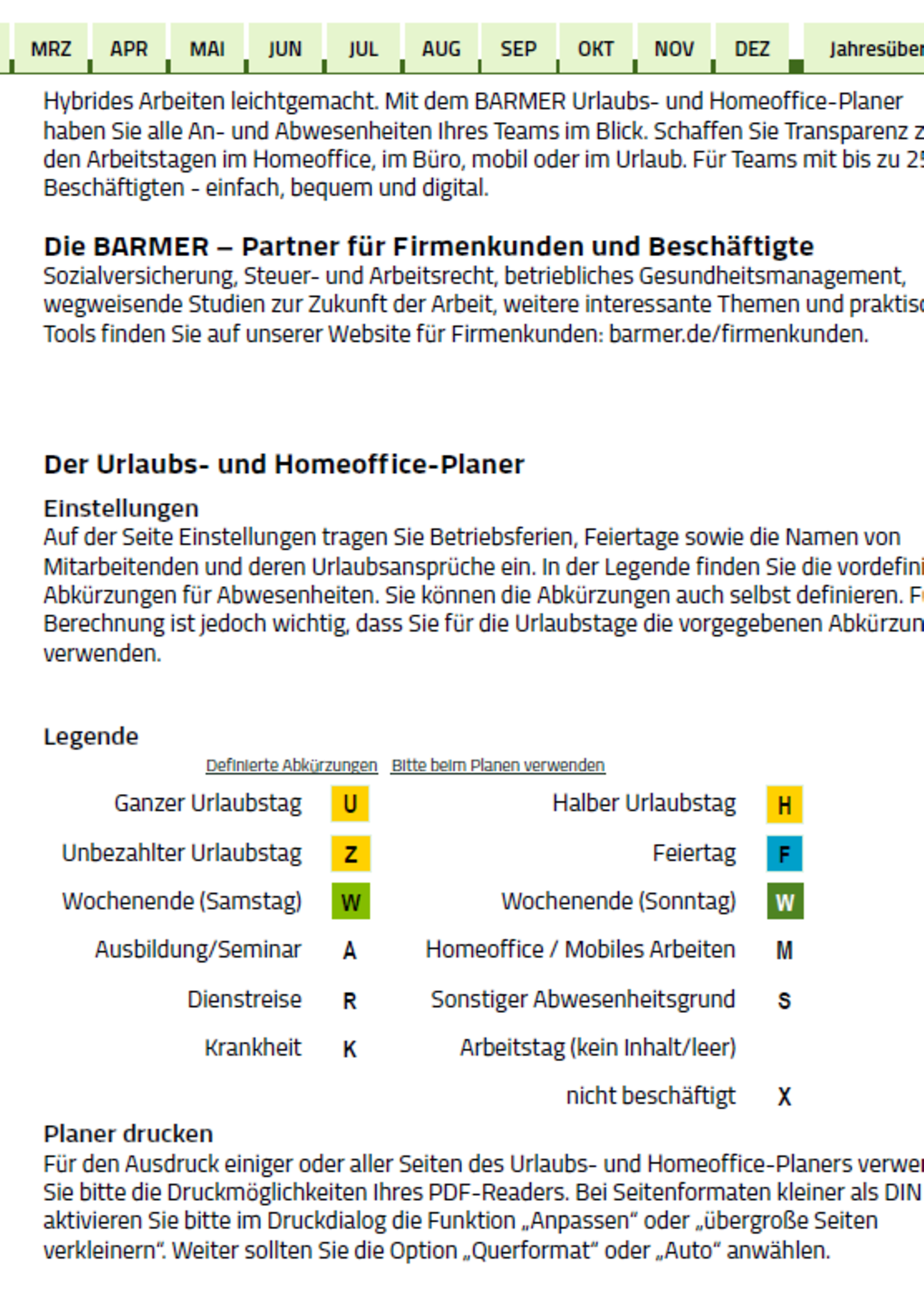 Auf der zweiten Seite des Urlaubs- und Homeoffice-Planers finden Sie die wichtigsten Grundeinstellungen. Tragen Sie hier zunächst Betriebsferien, Feiertage, Namen und Urlaubsansprüche Ihrer Mitarbeiterinnen und Mitarbeiter ein. Zusätzlich werden hier die wichtigsten Features erklärt und Hinweise zur Nutzung gegeben. Wo wird was eingetragen? Wofür steht welches Zeichen und welche Abkürzung? Und wie werden z. B. einzelne Seiten ausgedruckt?