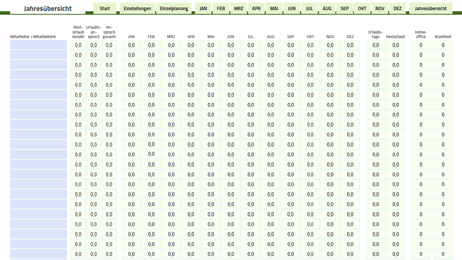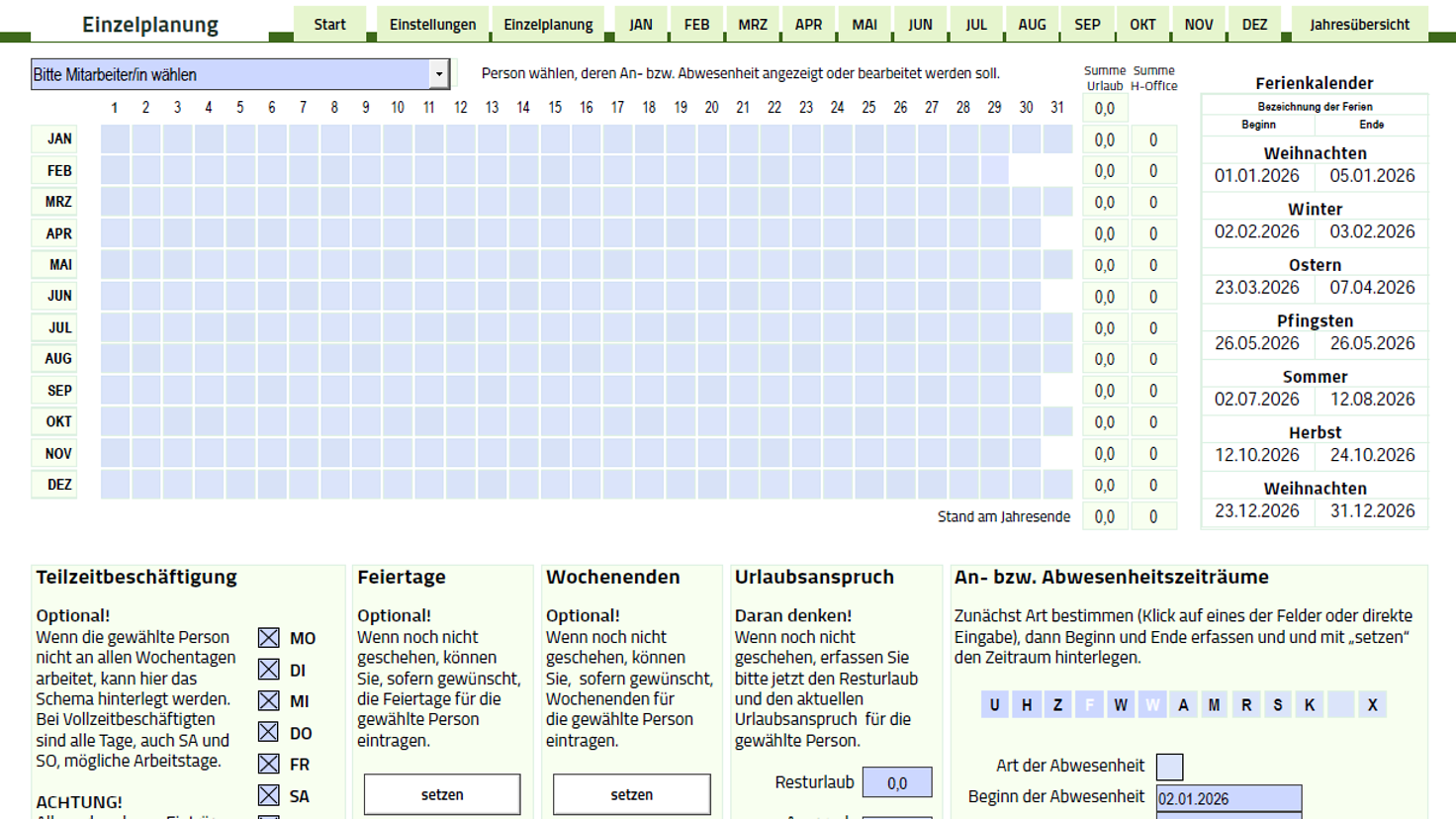 Sie können sich die An- und Abwesenheiten des gesamten Jahres für jede Kollegin und jeden Kollegen einzeln anzeigen lassen. Wählen Sie einfach im Menü des Urlaubsplaners die gewünschte Person aus. Die eingetragenen Zeiten werden automatisch zusammengerechnet und angelegt.