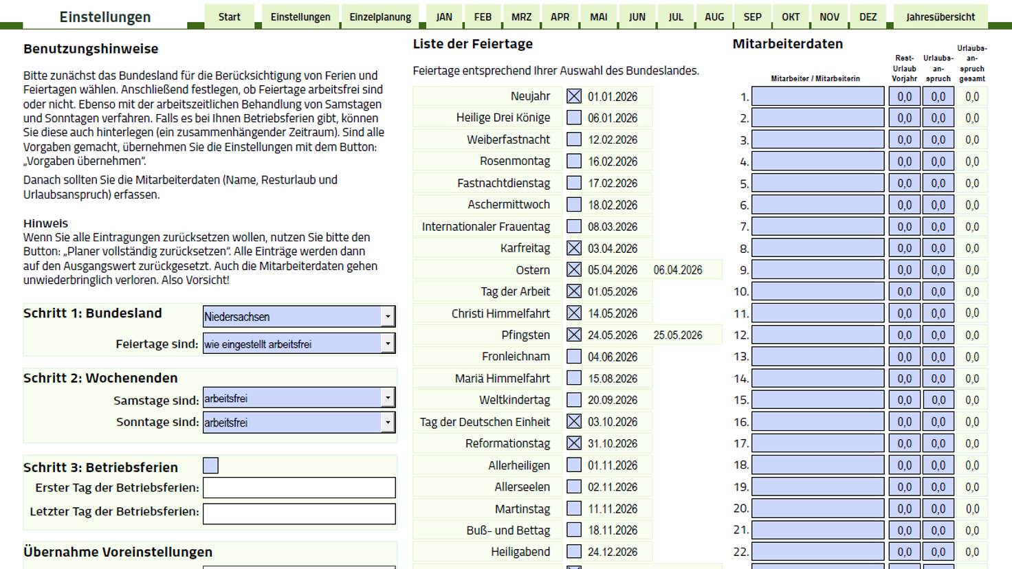 Auf der zweiten Seite des Urlaubs- und Homeoffice-Planers finden Sie die wichtigsten Grundeinstellungen. Tragen Sie hier zunächst Betriebsferien, Feiertage, Namen und Urlaubsansprüche Ihrer Mitarbeiterinnen und Mitarbeiter ein. Zusätzlich werden hier die wichtigsten Features erklärt und Hinweise zur Nutzung gegeben. Wo wird was eingetragen? Wofür steht welches Zeichen und welche Abkürzung? Und wie werden z. B. einzelne Seiten ausgedruckt?
