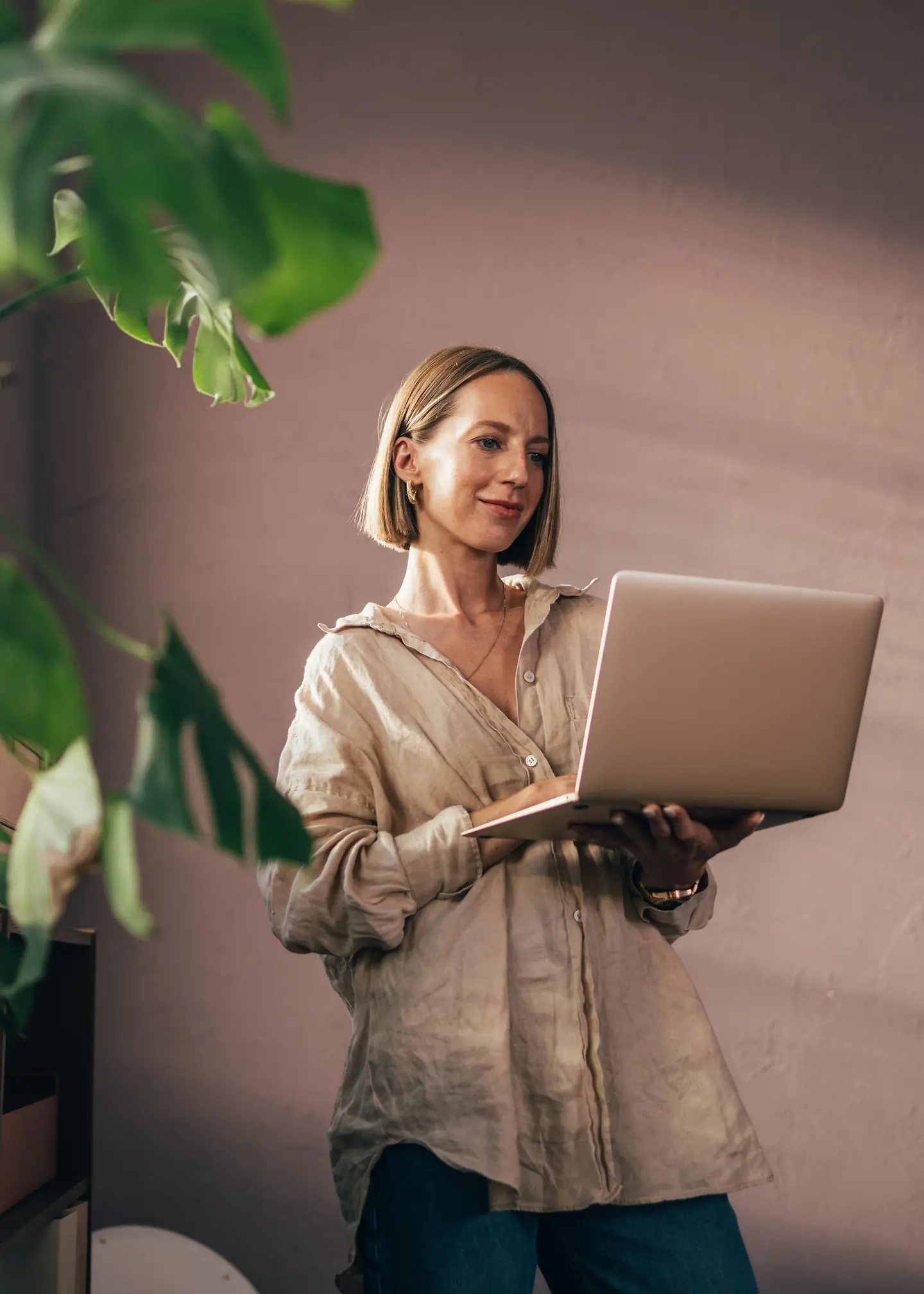Eine Frau steht am Fenster und schaut auf einen Laptop.