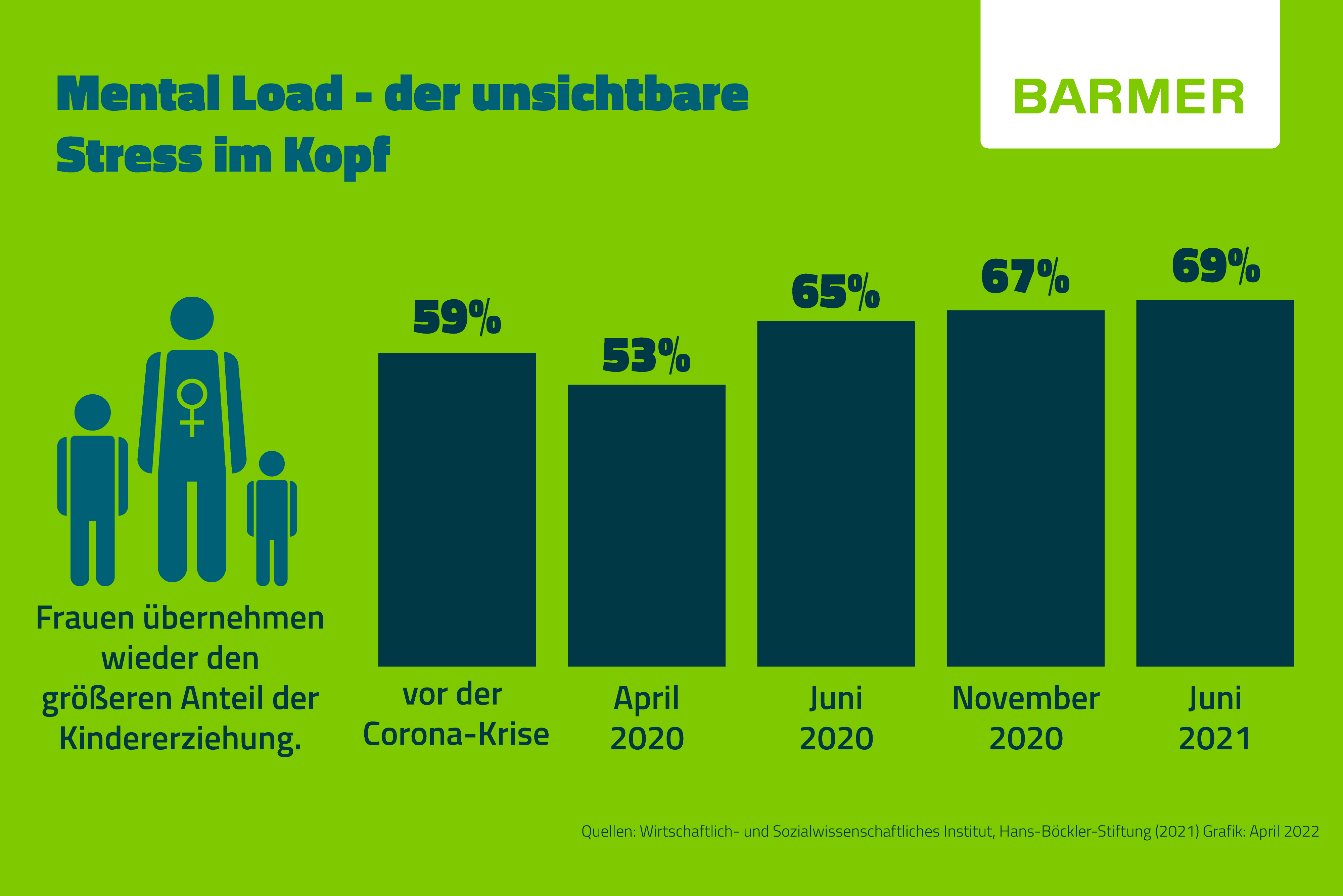 Untersuchungen zeigen, dass es in der Regel Frauen sind, die in den Familien mehr mentale Arbeit – und vor allem unbezahlte Arbeit – machen. Im Zweiten Gleichstellungsbericht der Bundesregierung heißt es, dass Frauen 52,4 Prozent mehr Zeit für Care-Arbeit pro Tag aufwenden als Männer. Das sind zwei Stunden und 47 Minuten bei den Männern, vier Stunden und 13 Minuten bei den Frauen – der sogenannte „Gender Care Gap“ liegt also bei 87 Minuten Unterschied.