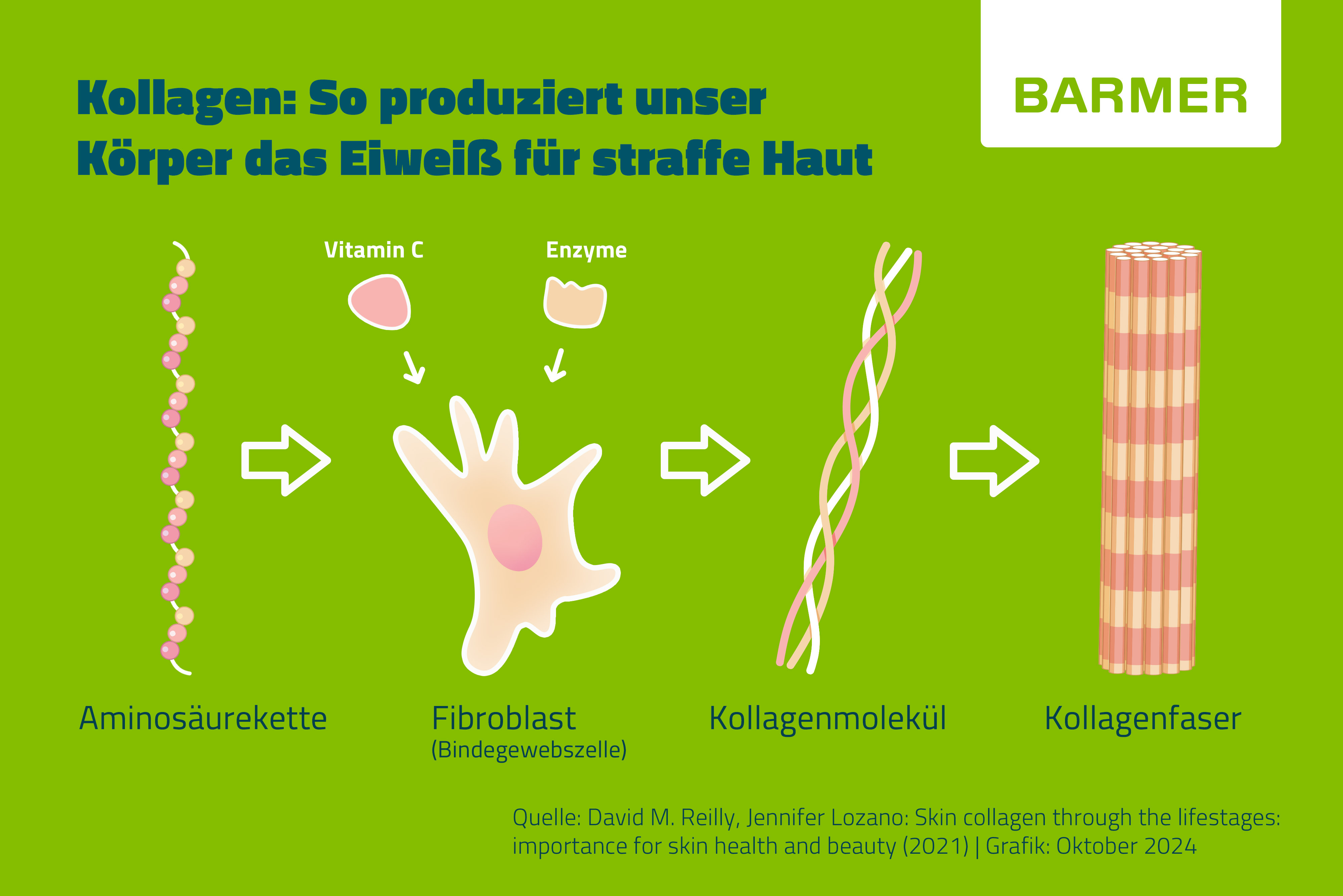 Wie alle Eiweiße bestehen auch Kollagene aus miteinander verbundenen Aminosäuren. Bei Kollagen sind das vor allem die Aminosäuren Prolin und Glyzin. Kollagene werden aus drei Ketten aufgebaut, die eine sogenannte Tripelhelix formen – die man sich wie eine eng gewobene Schnur aus drei Wollfäden vorstellen kann. In unserem Körper sind spezialisierte Zellen, die sogenannten Fibroblasten, hauptsächlich für die Produktion von Kollagen verantwortlich.