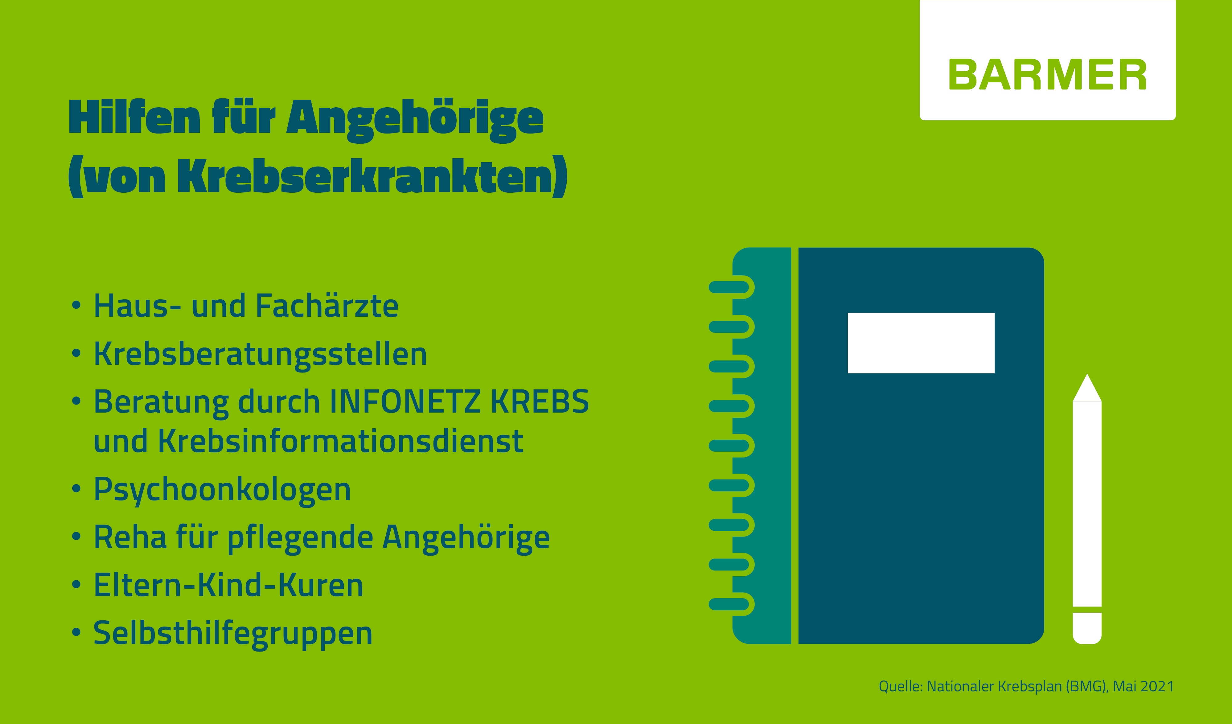Für pflegende Angehörige von Krebspatienten besteht auch die Möglichkeit, eine Reha (früher sprach man von einer Kur) für sich selbst zu beantragen. Den Antrag dazu füllt der Hausarzt oder die Hausärztin aus, nachdem Sie Ihre Situation und die damit einhergehenden Belastungen geschildert haben . Eine weitere gute Unterstützungsmöglichkeit sind Eltern-Kind-Kuren.