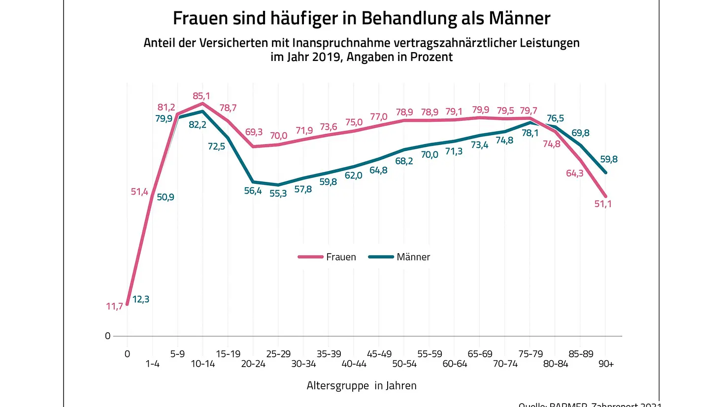 Nicht immer sind die Unterschiede aber so deutlich ausgeprägt: Bis zum Alter von 14 Jahren lagen Mädchen und Jungen im Jahr 2019 nämlich praktisch gleichauf. Danach sank die Bereitschaft für einen Zahnarztbesuch übrigens bei beiden Geschlechtern ab – nur eben bei den Frauen weniger als bei den Männern. Im Alter zwischen 75 und 85 lagen Frauen und Männer dann wieder beinahe gleichauf.