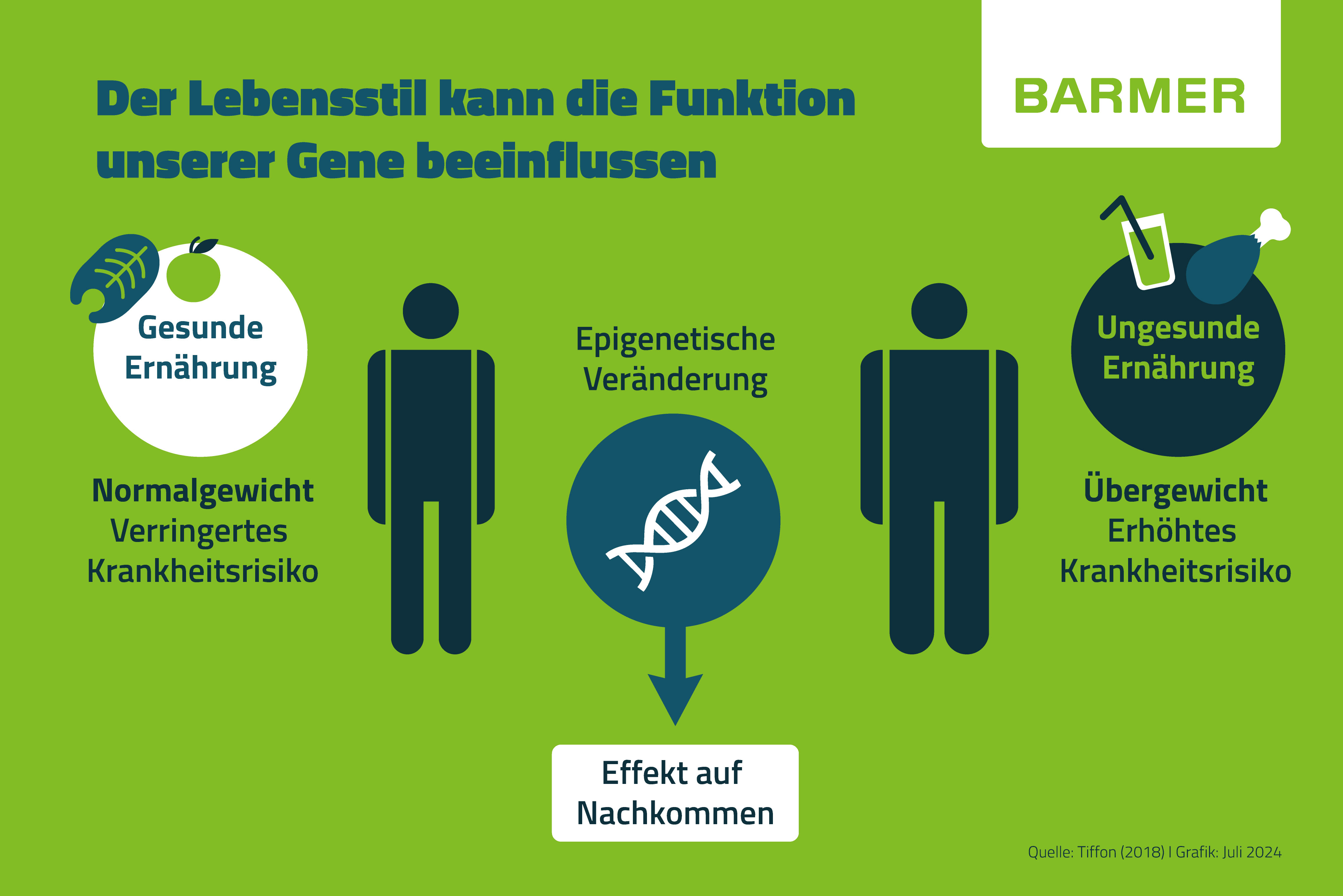 Der Einfluss der Ernährung auf die Epigenetik macht nicht beim eigenen Körper halt, sondern kann mehrere Generationen umspannen. Liegen bei Vater oder Mutter epigenetische Veränderungen vor, etwa aufgrund der Ernährung, können diese auf das Kind übertragen werden.