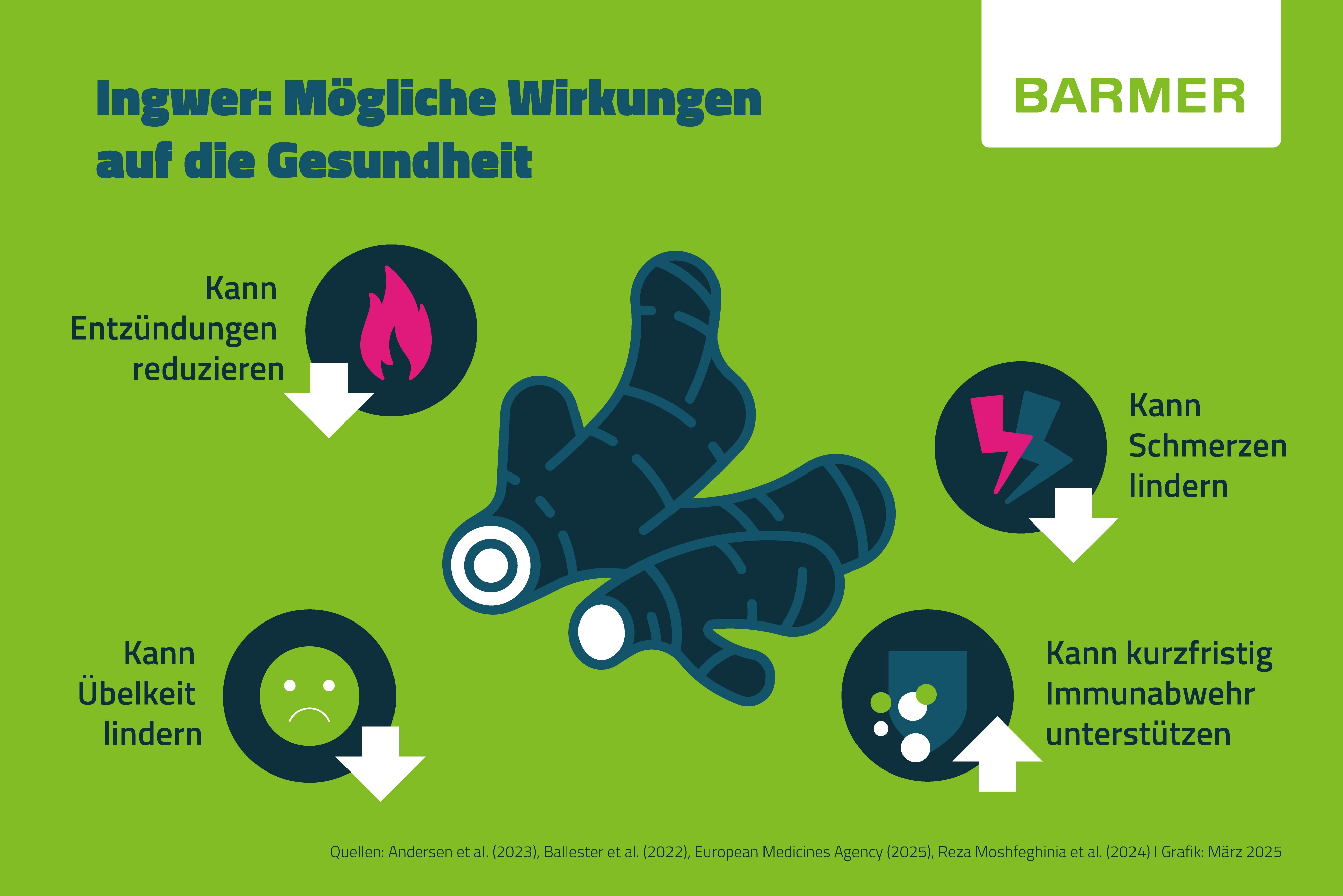 Verschiedene positive Wirkungen von Ingwer werden diskutiert. Er wird zum Beispiel gegen Übelkeit eingesetzt und kann Entzündungen lindern.