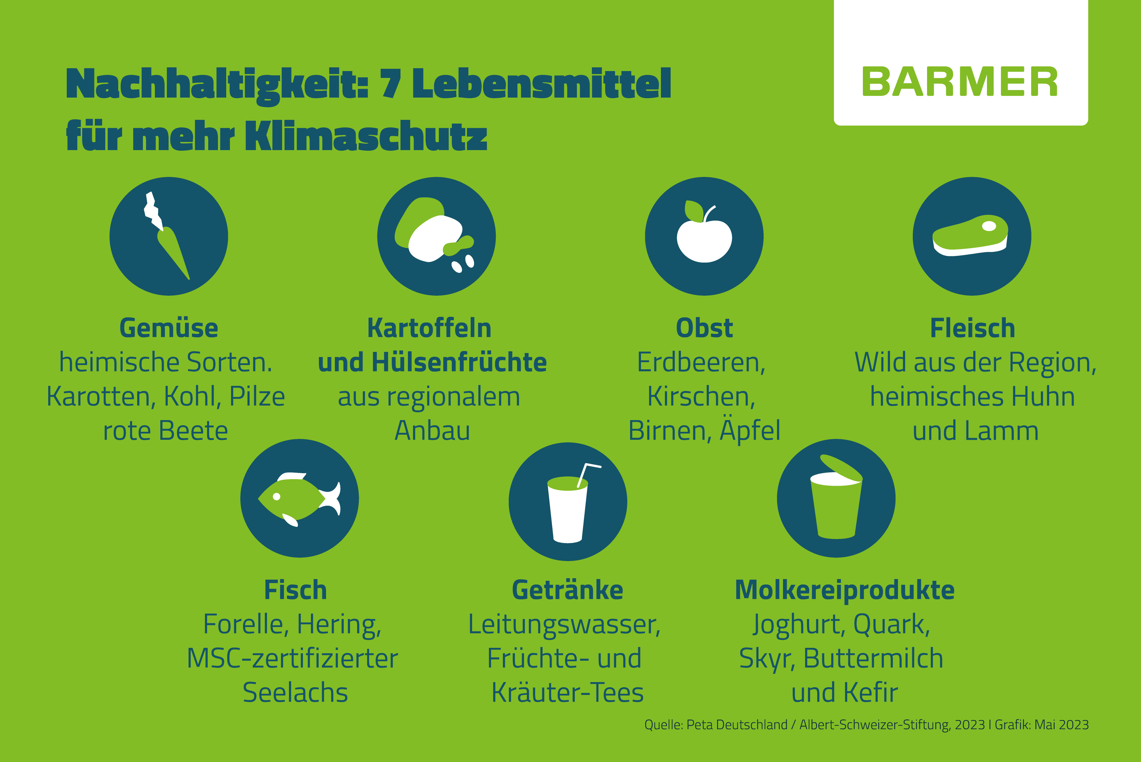 Im Mittelpunkt einer klimafreundlichen Ernährung stehen nachhaltige Lebensmittel wie Gemüse, Kartoffeln, Obst, Fisch, Fleisch und Molkereiprodukte