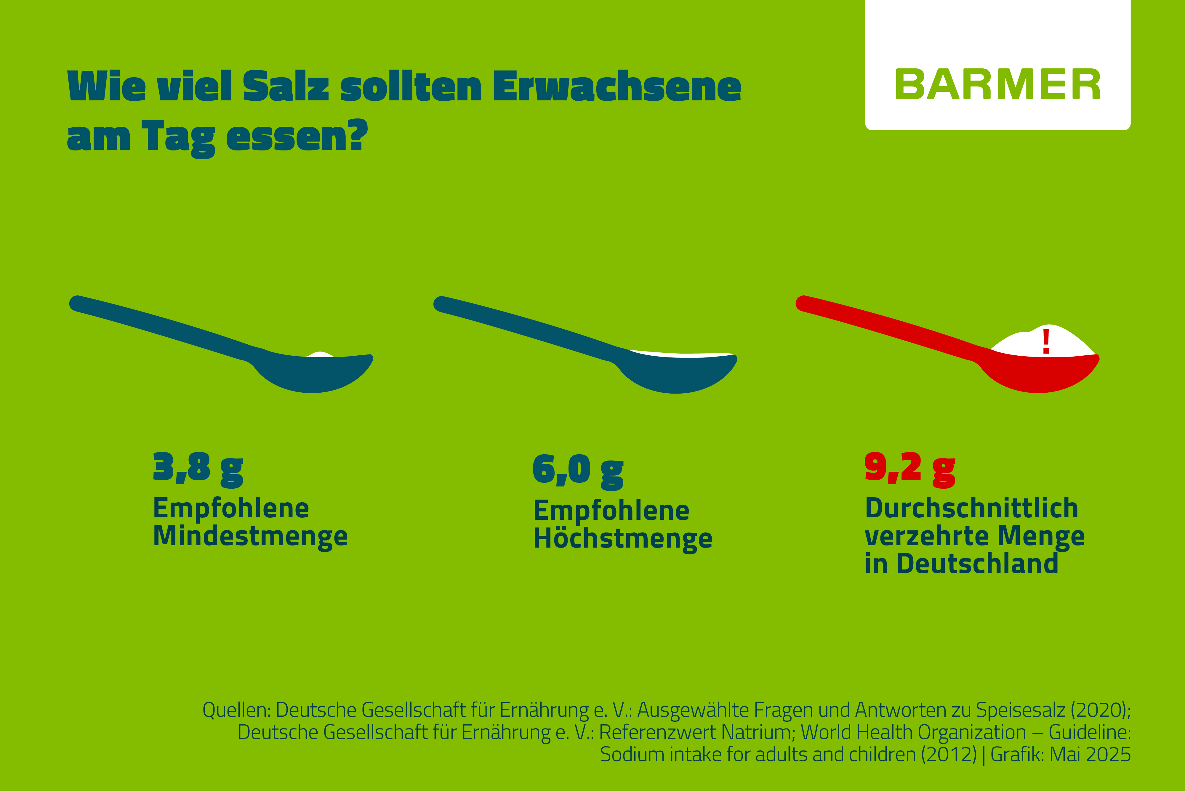 - Für Erwachsene ab 16 Jahren: nicht mehr als 6 Gramm Salz pro Tag