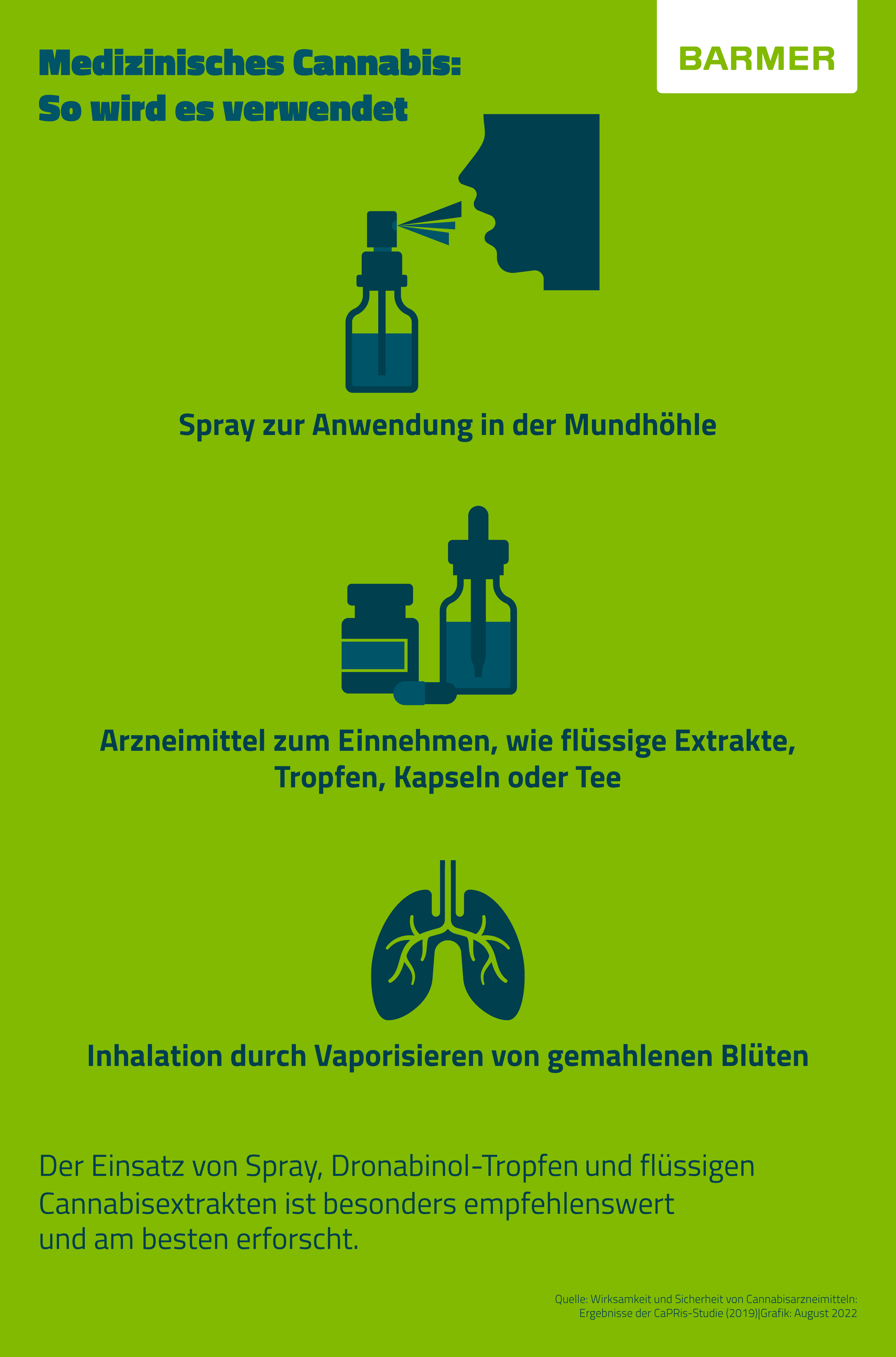 Der Einsatz von Spray, Dronabinol-Tropfen und flüssigen Cannabisextrakten ist besonders empfehlenswert und am besten erforscht. Diese Darreichungsformen sind leicht zu dosieren und anzuwenden. Sie werden langsam vom Körper resorbiert, wirken länger und bergen daher auch ein geringeres Risiko, missbräuchlich verwendet zu werden.