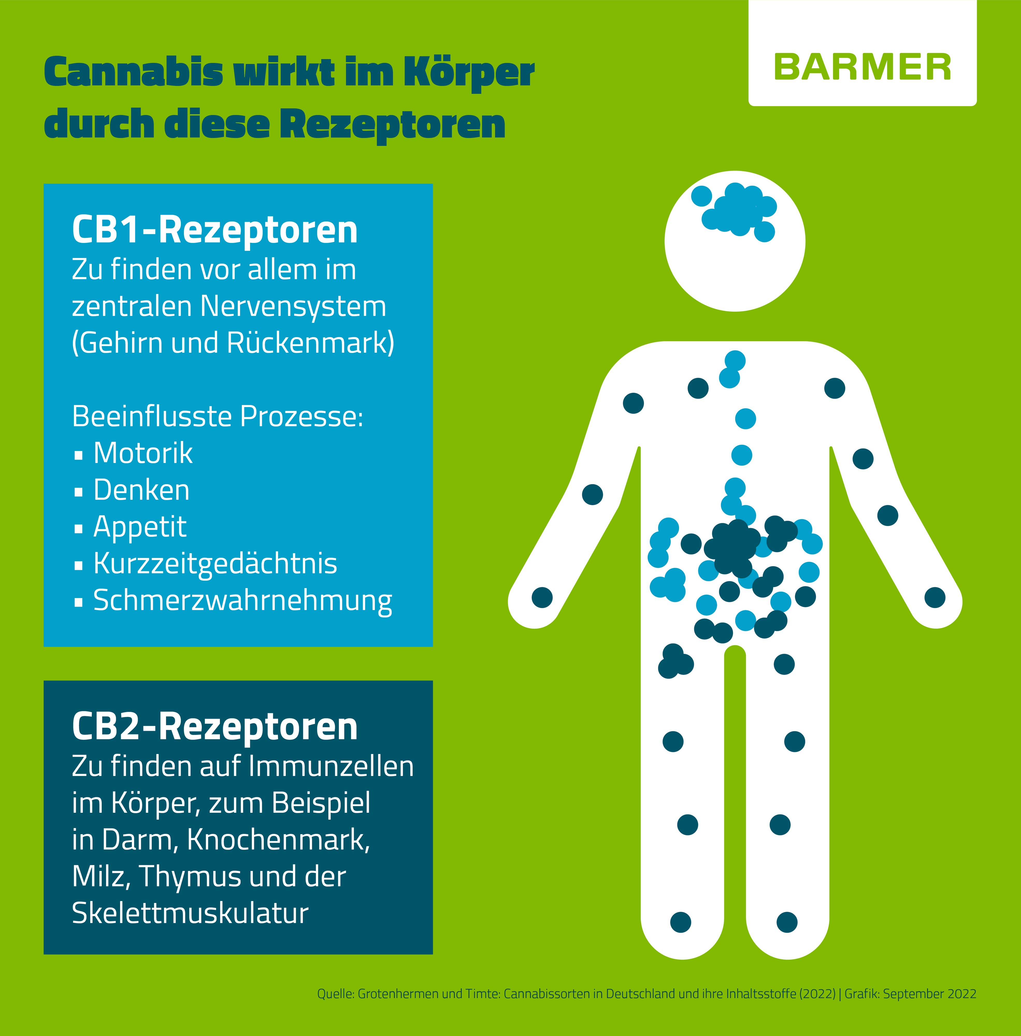 Die Cannabinoidrezeptoren befinden sich auf verschiedenen Zelltypen des Körpers. CB1 findet sich hauptsächlich im Gehirn und Nervensystem aber auch in Organen wie den Nieren und dem Darm. Durch die direkte Anbindung an die Nervenzellen und das Gehirn vermitteln CB1-Rezeptoren die berauschenden, psychoaktiven und euphorisierenden Aspekte von THC. CB2-Rezeptoren sind vor allem auf Zellen des Immunsystems zu finden, doch auch in einigen Organen wie Lunge, Milz, Haut, Knochen, Magen-Darm-Trakt und den Fortpflanzungsorganen.