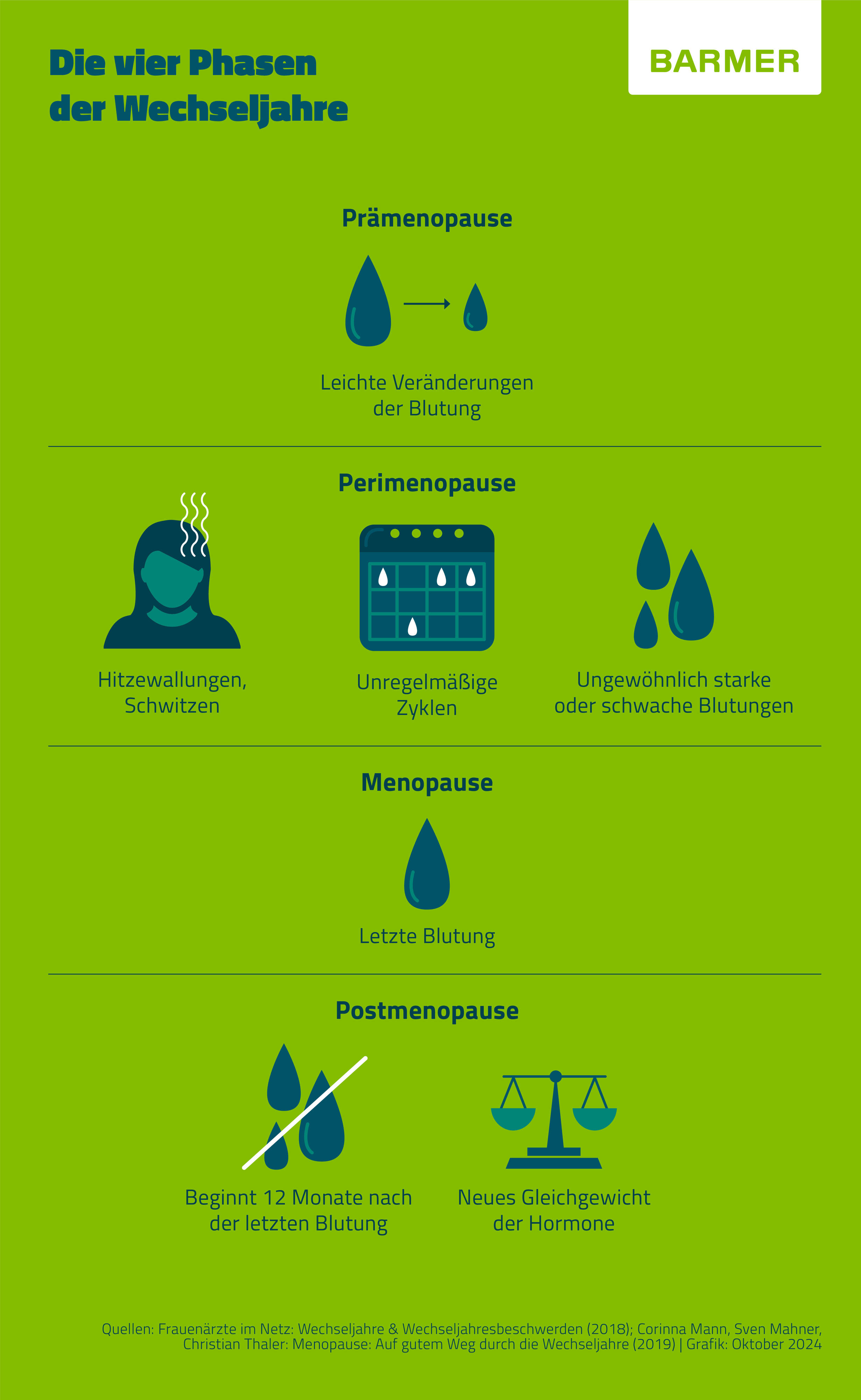- Postmenopause: Diese Zeit beginnt zwölf Monate nach der letzten Blutung – in dieser Phase stellt sich nach und nach ein neues Gleichgewicht der Hormone ein.