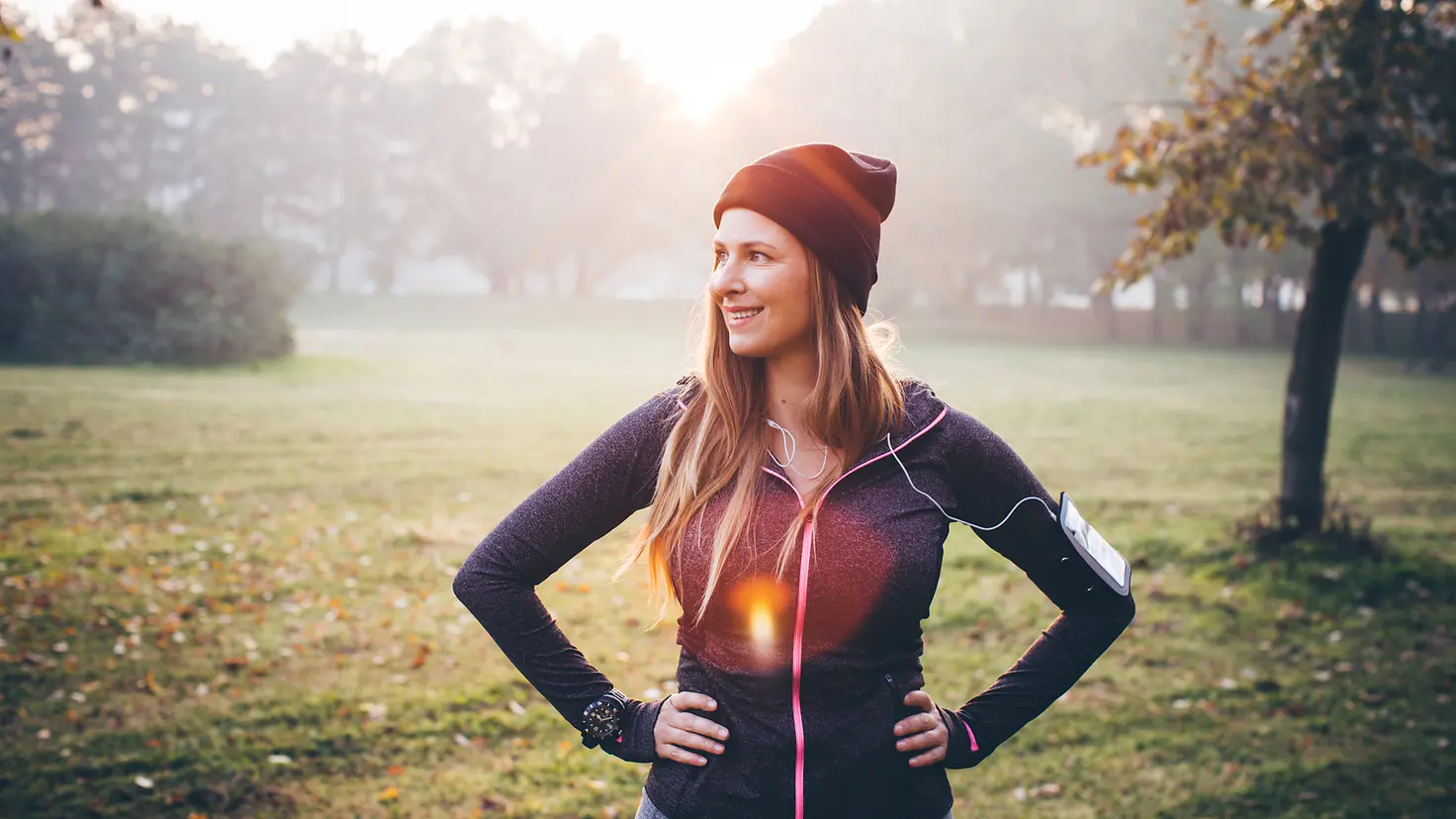 Eine junge Frau im Laufdress steht auf einer Wiese