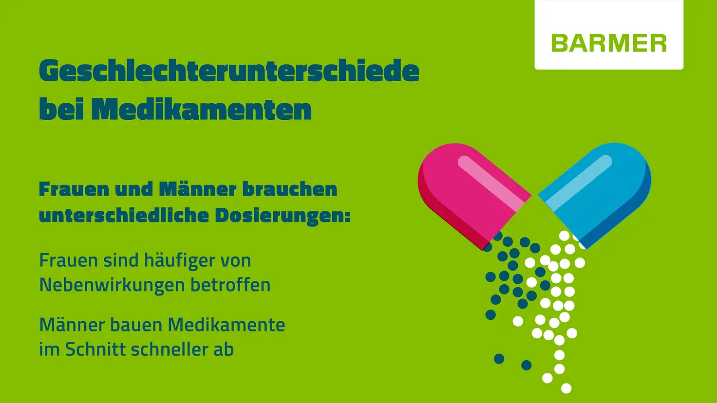 Eine Frau und ein Mann nehmen das gleiche Medikament – doch das Risiko für Nebenwirkungen ist für die Frau höher. Wie kann das sein? Das Geschlecht und auch das Alter beeinflussen, wie schnell der Körper ein Medikament abbaut und damit auch, wie lange und wie stark es wirkt. Zusätzlich können soziokulturelle Einflüsse eine Rolle spielen. Ärztinnen und Ärzte stimmen daher bei bestimmten Medikamenten die Dosierung individuell auf geschlechtsspezifische Unterschiede ab.