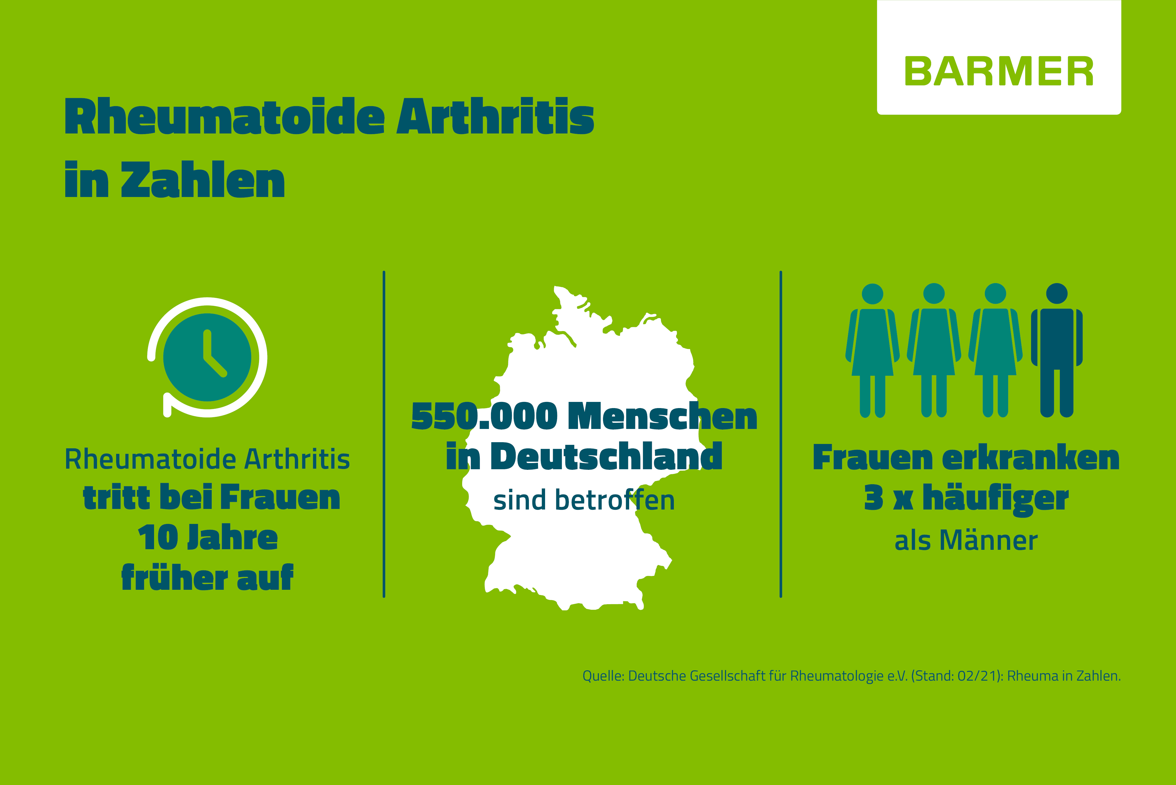 Knapp 1 von 100 Erwachsenen in Deutschland ist an rheumatoider Arthritis erkrankt. Das sind etwa 550.000 Menschen, was ungefähr der Einwohnerzahl von Hannover entspricht. Dabei erkranken Frauen etwa 3-mal so häufig wie Männer – und im Durchschnitt zehn Jahre früher. Neben dem weiblichen Geschlecht gibt es weitere Risikofaktoren für rheumatoide Arthritis wie bestimmte genetische Faktoren, höheres Alter, Rauchen und Übergewicht.