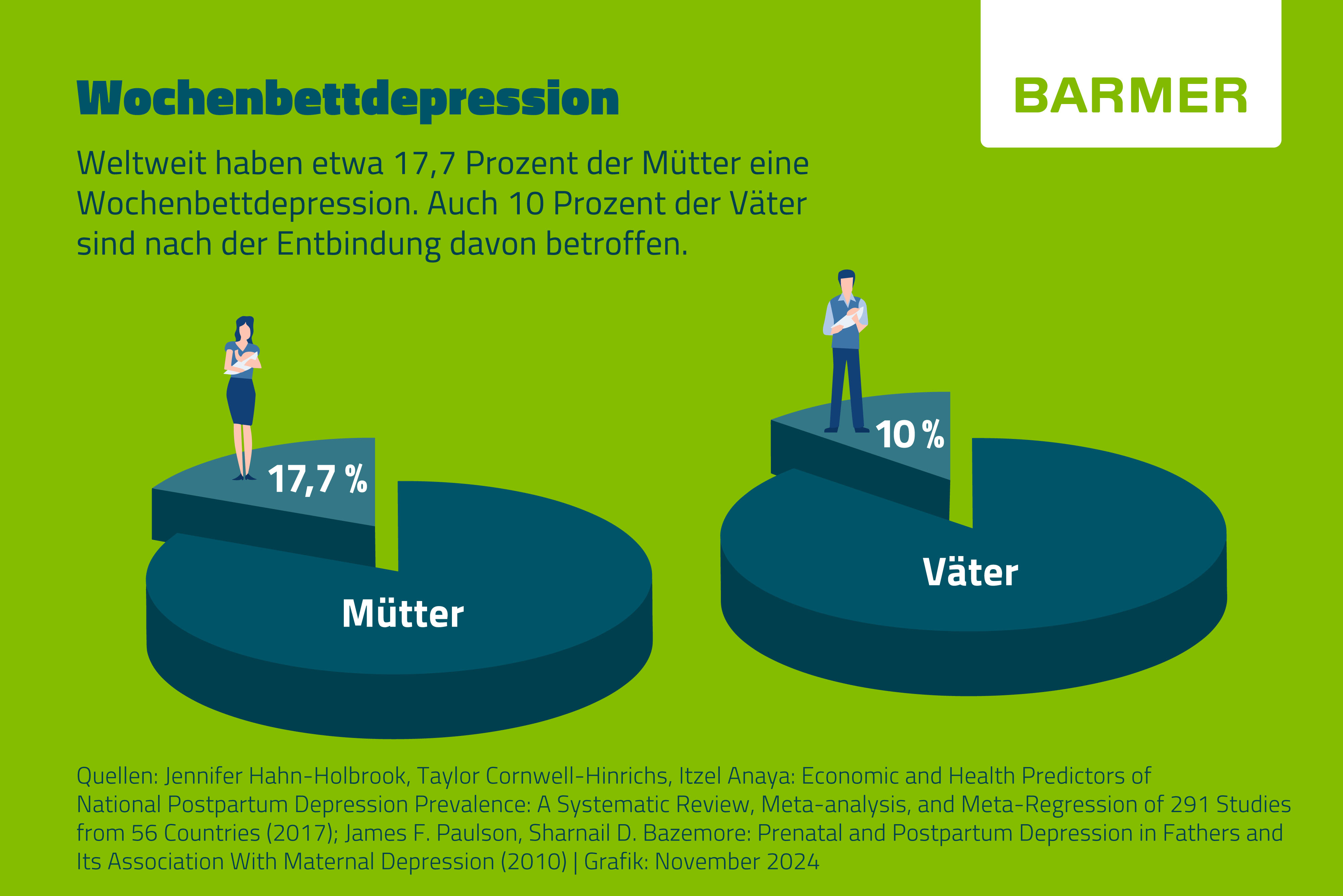 Bei der Wochenbettdepression handelt es sich, anders als beim Babyblues, um eine ernst zu nehmende depressive Erkrankung. Sie tritt in der Regel zwei bis acht Wochen nach der Geburt auf, kann aber auch noch bis zu einem Jahr nach der Geburt des Kindes einsetzen. Die postpartale Depression tritt plötzlich oder schleichend auf. Eine Auswertung von 291 Studien aus 56 Ländern deutet darauf hin, dass weltweit etwa 17,7 Prozent der Frauen von einer Wochenbettdepression betroffen sind. Aber: Auch Männer können an dieser Form der Depression erkranken. Schätzungsweise ist das bei 10 Prozent der Väter innerhalb des ersten Jahres nach der Entbindung der Fall.