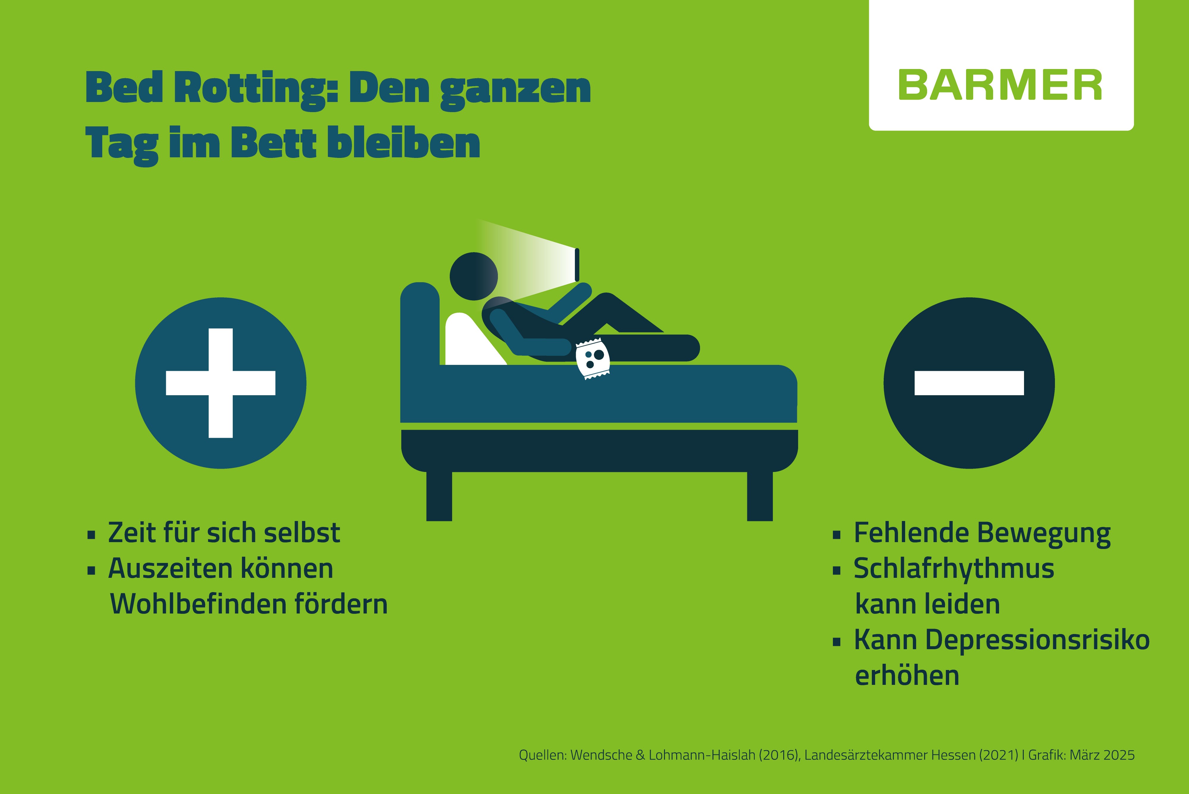 Menschen, die Bed Rotting betreiben, nehmen sich Zeit für sich selbst. Das kann ein Ausgleich zum stressigen Alltag mit Zeitdruck und Verpflichtungen sein. Generell gilt: Sich bewusst Auszeiten zu schaffen und Arbeitspausen einzulegen, ist für die physische und psychische Gesundheit förderlich und kann das Wohlbefinden steigern. Damit ist aber nicht gemeint, sich tagelang zu Hause vor Verpflichtungen und der Außenwelt zu vergraben. Auch wenn viele Menschen davon überzeugt sind, dass ihnen Bed Rotting guttut, sie so Erholung für Körper und Geist erfahren und Stress abbauen – wissenschaftlich belegt ist dies aufgrund fehlender Studien nicht.