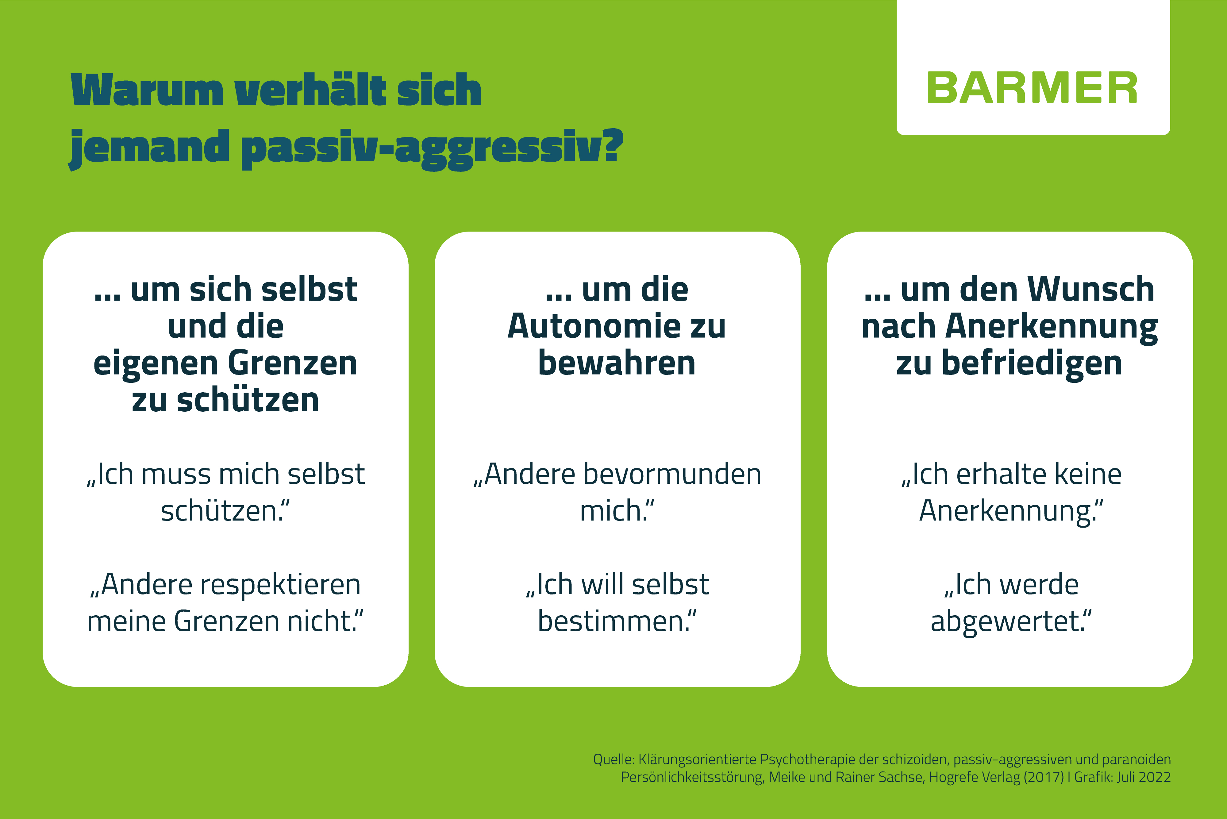 Doch wie kommt es soweit? Sachse macht drei zentrale Motive aus, die das Handeln und Denken von Menschen lenken, wenn sie sich passiv-aggressiv verhalten: die Unverletzlichkeit der eigenen Grenzen, die Autonomie und die Anerkennung.
