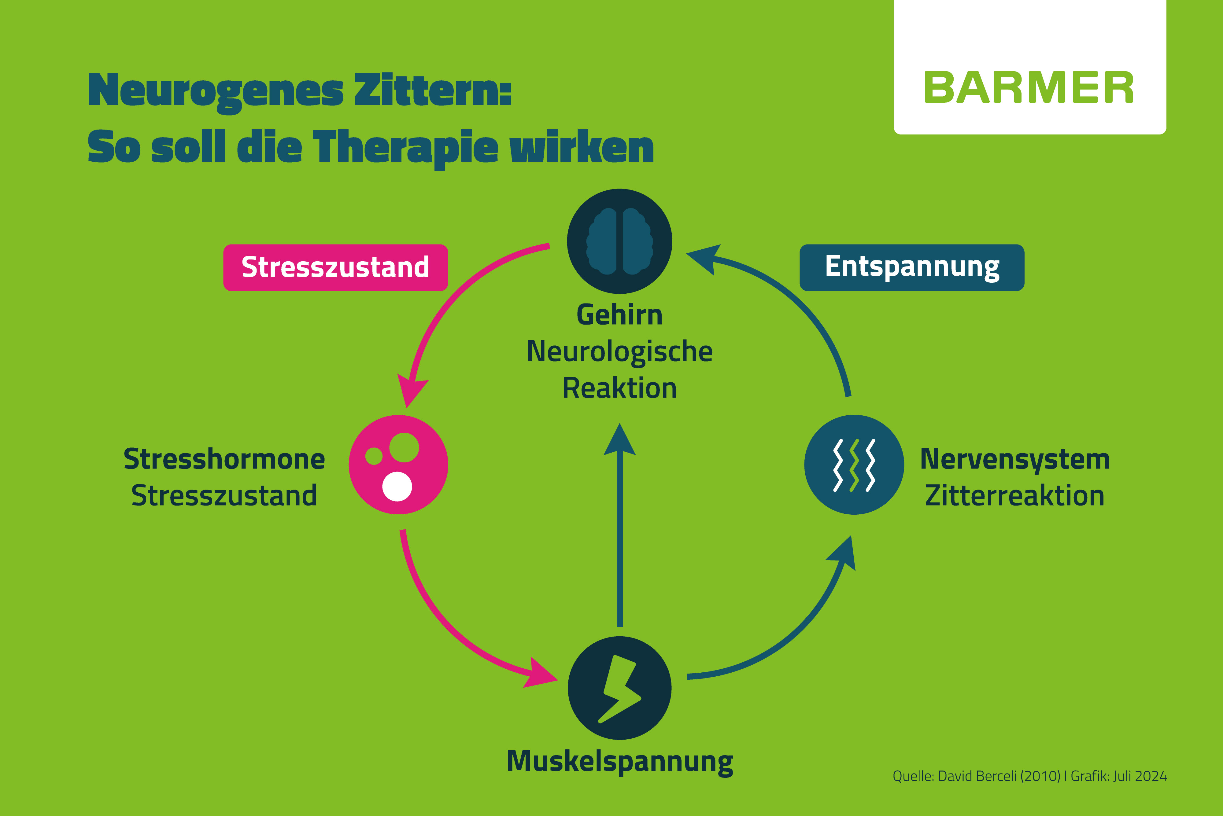 Vorab: Einen empirisch gesicherten Nachweis über die Wirkmechanismen und die Wirksamkeit von neurogenem Zittern gibt es bislang nicht. Laut dem Entwickler der Technik, David Berceli, soll das Zittern tiefsitzende Spannungen im Körper lösen und das Nervensystem so regulieren, dass ein Zustand der Ruhe und Entspannung erreicht wird. Der Prozess soll dabei auf einer komplett unbewussten Ebene passieren.
