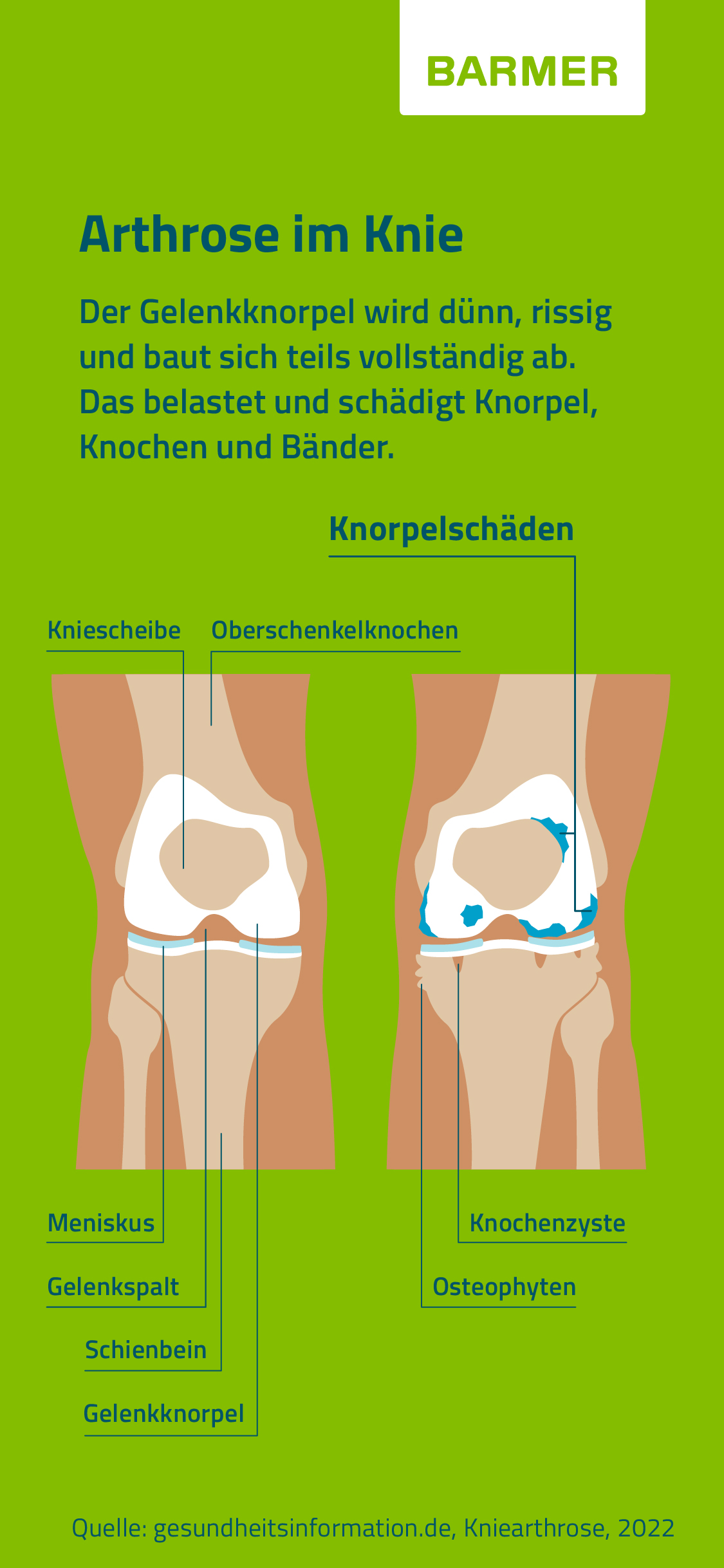 In einem gesunden Gelenk schützt Knorpel wie eine Art Polster davor, dass Knochen direkt aufeinander reiben. Bei einer Arthrose verschleißt dieser Knorpelüberzug im Gelenk, wird rissig und dünner. Ärztinnen und Ärzte nennen das Degeneration, durch den Verschleiß steigt die Belastung auf die Knochen. Reiben Knochen aufeinander, verursacht das Schmerzen. Entzündungen im Gelenk (Arthritis) können diese noch verstärken. Anfangs treten Schmerzen bei Bewegung auf, im Verlauf ebenso in Ruhe. Mit der Zeit ist das Gelenk immer weniger beweglich. Umgangssprachlich heißt die Arthrose auch Gelenkverschleiß.