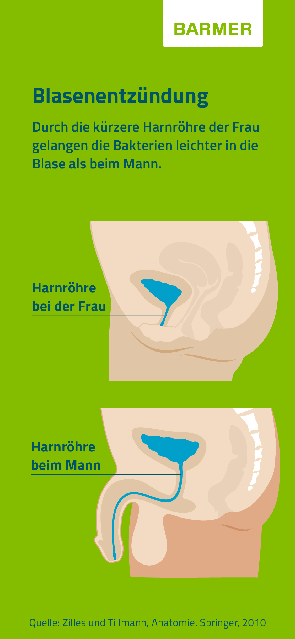 - Geschlecht: Frauen erkranken wesentlich häufiger an einer Blasenentzündung als Männer. Der Grund: Ihre Harnröhre ist mit etwa vier Zentimetern deutlich kürzer. Außerdem liegen die Ausgänge von Harnröhre und After bei Frauen dichter beieinander. Dies erleichtert ein Eindringen von Bakterien aus dem Darm oder dem Intimbereich in die Harnröhre.