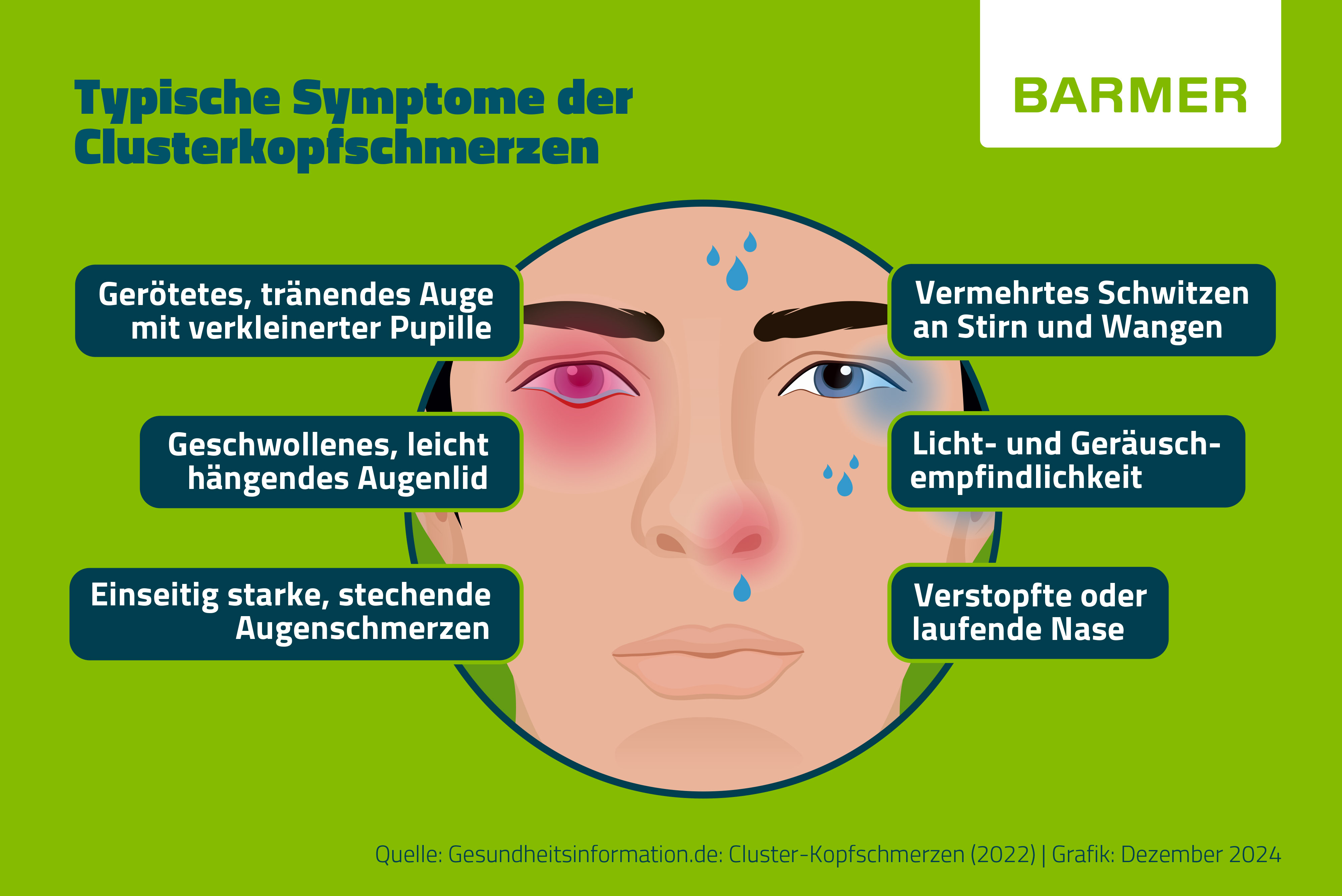 Zusätzlich zu den heftigen Kopfschmerzen gibt es beim Clusterkopfschmerz weitere kennzeichnende Symptome (siehe auch Infografik oben):