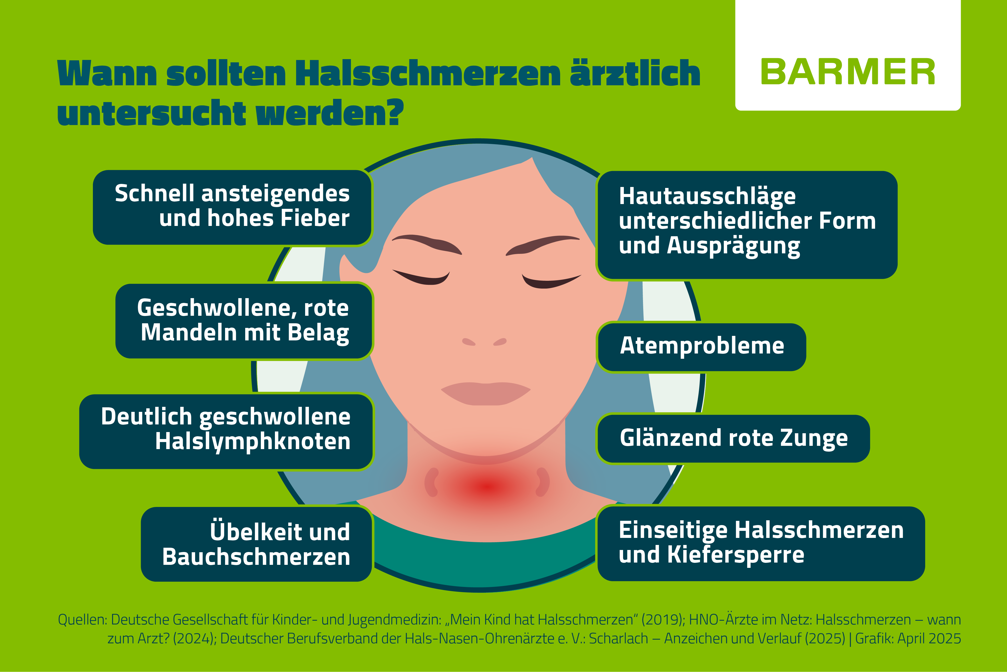 Bei diesen Warnzeichen und wenn die Halsschmerzen sehr stark sind beziehungsweise länger als einige Tage anhalten, sollte umgehend eine Arztpraxis kontaktiert werden. Denn hinter diesen Anzeichen können ernst zu nehmende Erkrankungen stecken.