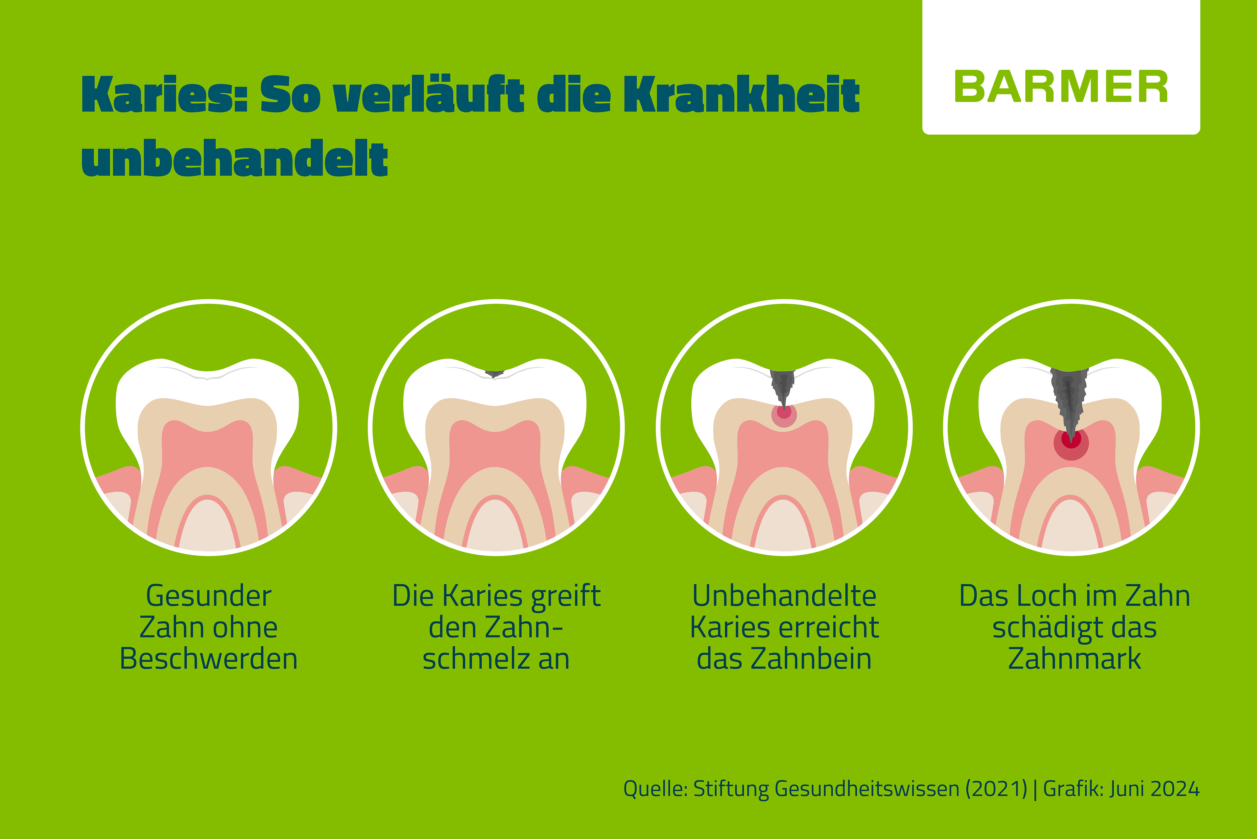 Karies beginnt an der Oberfläche des Zahns und greift zunächst den Zahnschmelz an. Wird die Karies nicht behandelt, frisst sie sich immer tiefer in den Zahn hinein und verursacht ein sich stetig vergrößerndes Loch. Erreicht die Karies das Zahnbein, verläuft der Zerstörungsprozess deutlich schneller: Es kann zur Entzündung des betreffenden Zahnes kommen und damit auch zur Schädigung des Zahnmarks.
