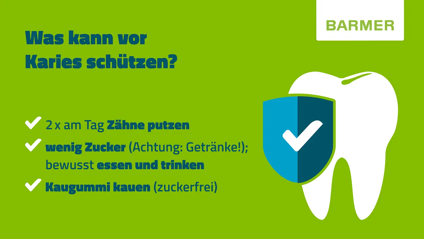 Mundhygiene und eine möglichst zuckerarme Ernährung sind die wichtigsten Faktoren, um die Zähne vor Karies zu schützen. Es ist beispielsweise besser, Wasser zu trinken als Saftschorlen. Säfte enthalten immer Fruchtzucker, auch viele Fertigtees sind zuckerhaltig. Regelmäßige Vorsorgetermine in der Zahnarztpraxis sind außerdem wichtig, um Anfälligkeiten für Karies frühzeitig zu entdecken.