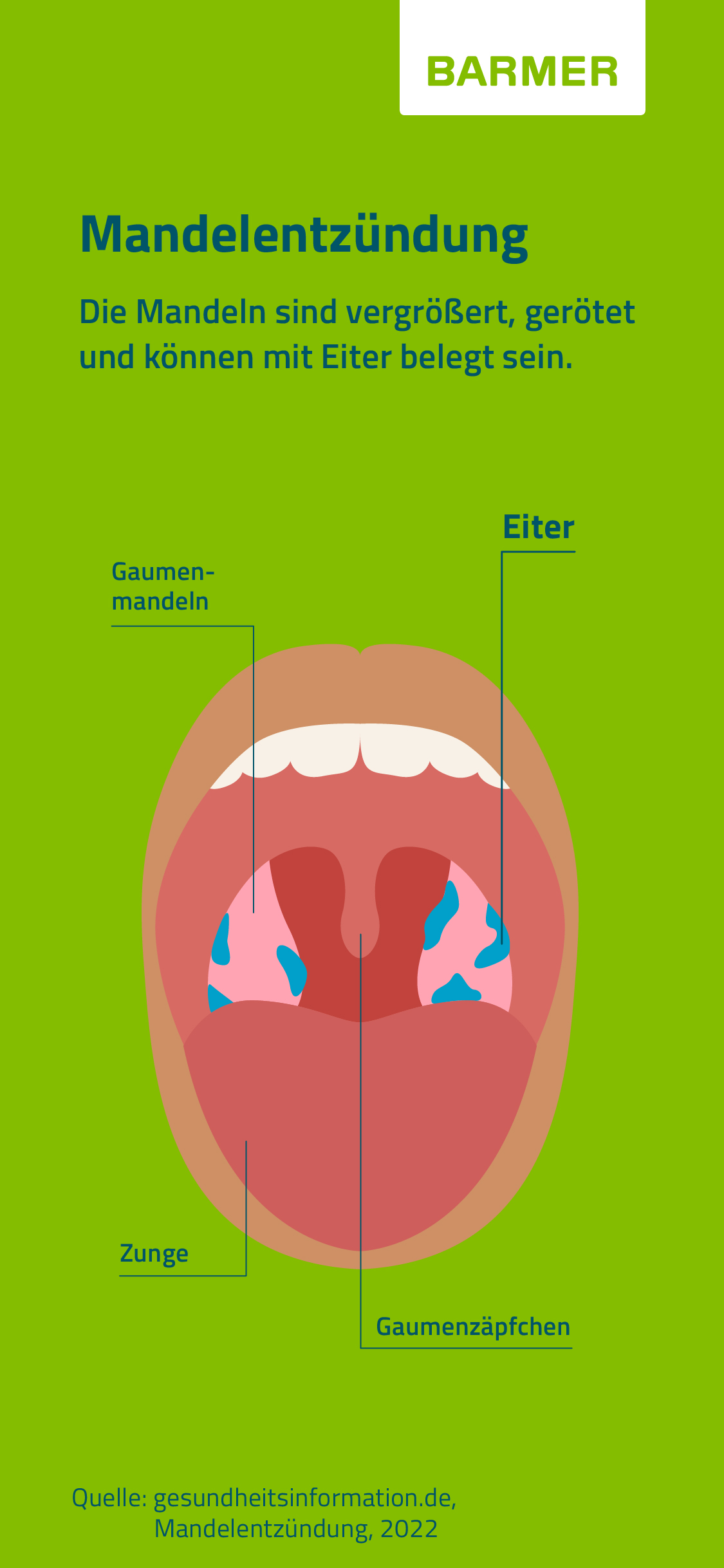 Eine Mandelentzündung (auch „Tonsillitis“ oder „Angina tonsillaris“) ist eine Entzündung der Gaumenmandeln. Die Entzündung kann Schluckschmerzen und andere Symptome wie Fieber auslösen und wird durch Viren oder Bakterien verursacht.