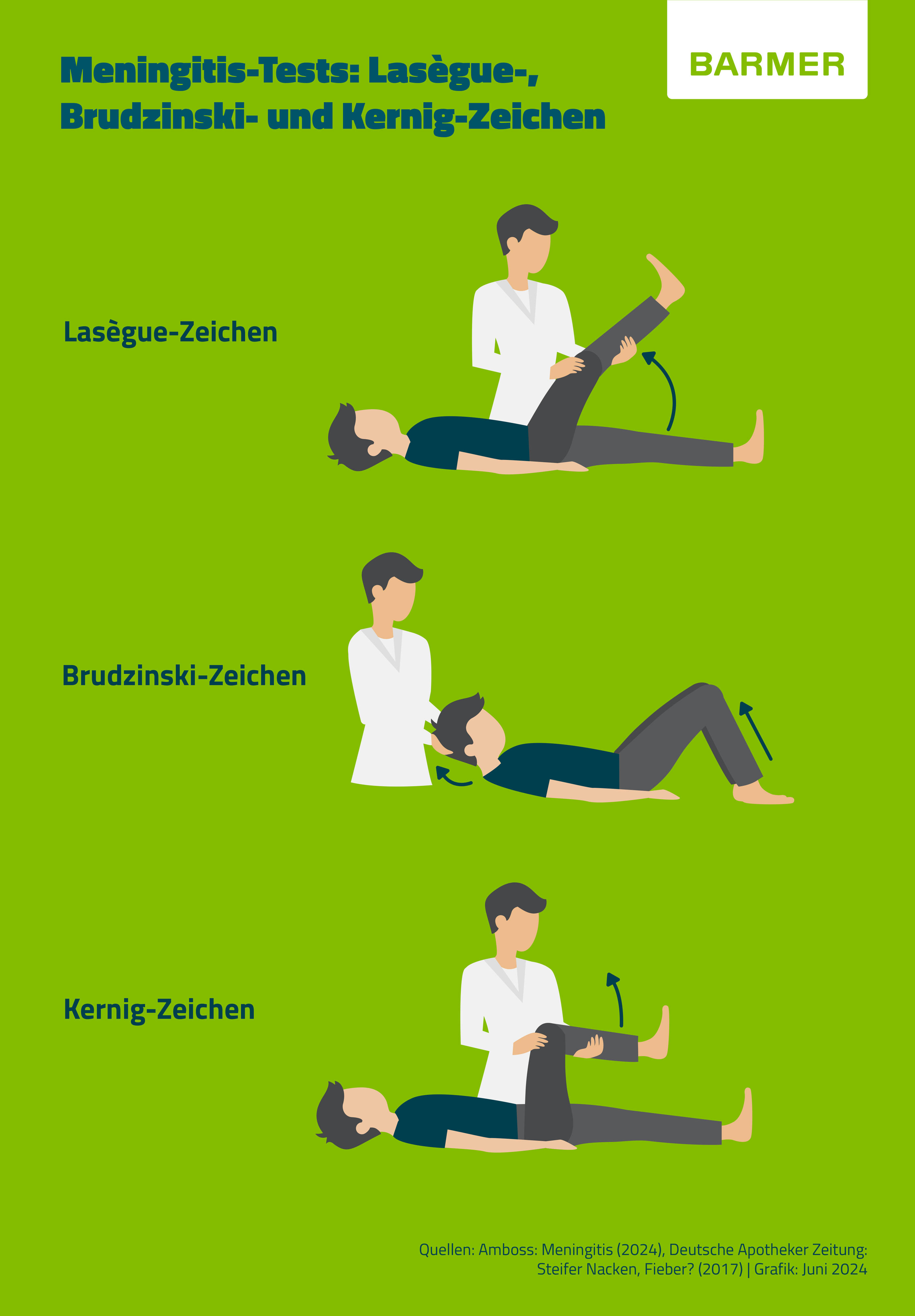 - Brudzinski-Zeichen: Hierbei wird der Kopf der auf dem Rücken liegenden Person passiv nach vorn gebeugt. Lässt sich dadurch eine reflexhafte Bewegung von Knie- und Hüftgelenk auslösen, wird dies als positives Testergebnis gewertet.