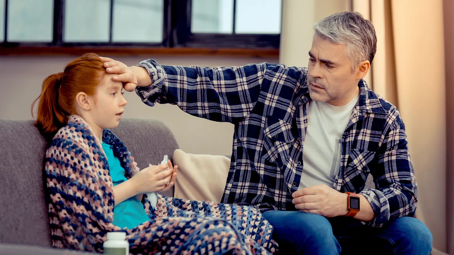 Ein Vater überprüft die Krankheits-Temperatur seiner Tochter mit der Hand