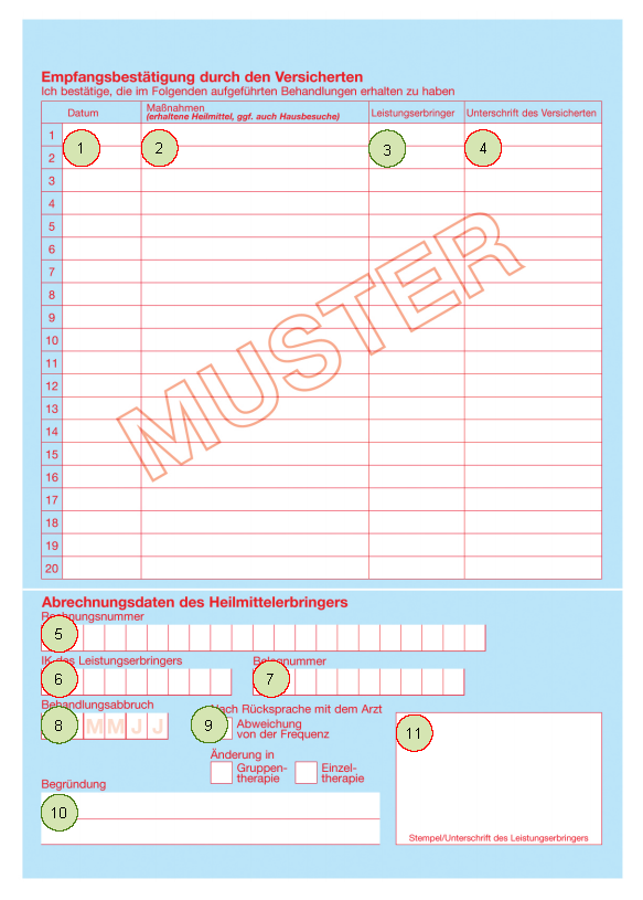 | 11 | Stempel/Unterschrift des Leistungserbringers: Leistungserbringer bestätigen die Einhaltung des jeweiligen Rahmenvertrags und die Richtigkeit der angegebenen Informationen mit einem Praxisstempel und ihrer Unterschrift. |