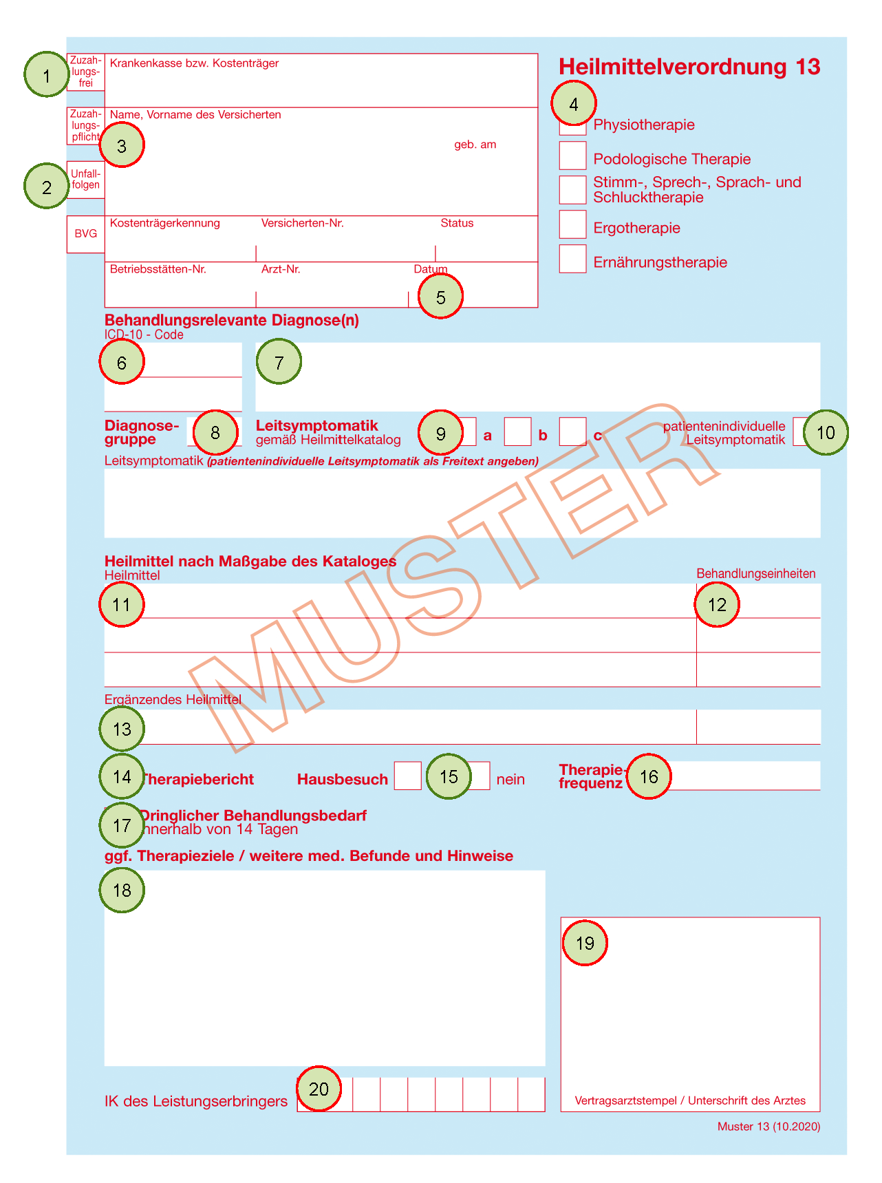 | 17 | Dringlicher Behandlungsbedarf: Durch Ankreuzen legt der Verordner fest, dass die Behandlung aus medizinischen Gründen bereits innerhalb von 14 Kalendertagen beginnen muss. |