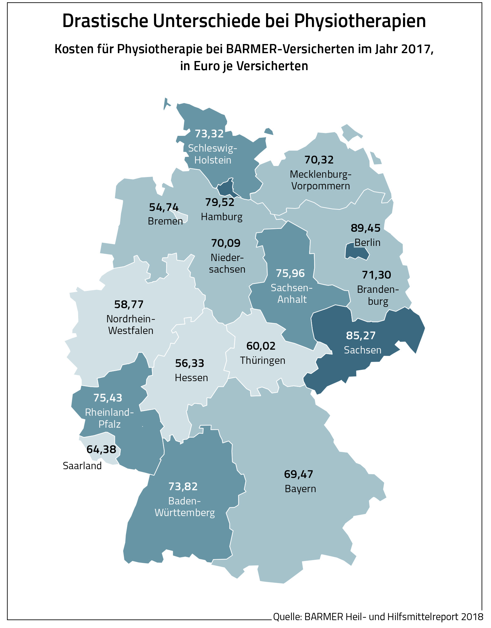 Berlin, 16.01.2019 – Bei den Ausgaben für Physiotherapie gibt es massive regionale Unterschiede. Während sich die Therapiekosten je Barmer-Versicherten im Jahr 2017 in Bremen auf 54,74 Euro beliefen, waren sie in Berlin mit 89,45 Euro um 63 Prozent höher. Bundesweit betrugen die Kosten je Barmer-Versicherten 68,33 Euro. Das geht aus dem Barmer-Heil- und Hilfsmittelreport 2018 hervor. „Die unterschiedlich hohen Ausgaben für die Physiotherapie sind rein medizinisch nicht erklärbar. Das unterschiedliche Verordnungsverhalten der Ärztinnen und Ärzte oder verschiedenartige Angebotsstrukturen könnten eine zentrale Rolle spielen“, sagt Professor Doktor Christoph Straub, Vorstandvorsitzender der Barmer. Nun seien weitere Analysen erforderlich, um die Ursachen der Kostendifferenzen bei Krankengymnastik, Lymphdrainagen und Massagen näher zu beleuchten. Dies sei auch deshalb erforderlich, da rund Dreiviertel aller Heilmittelkosten auf die Physiotherapie entfielen.