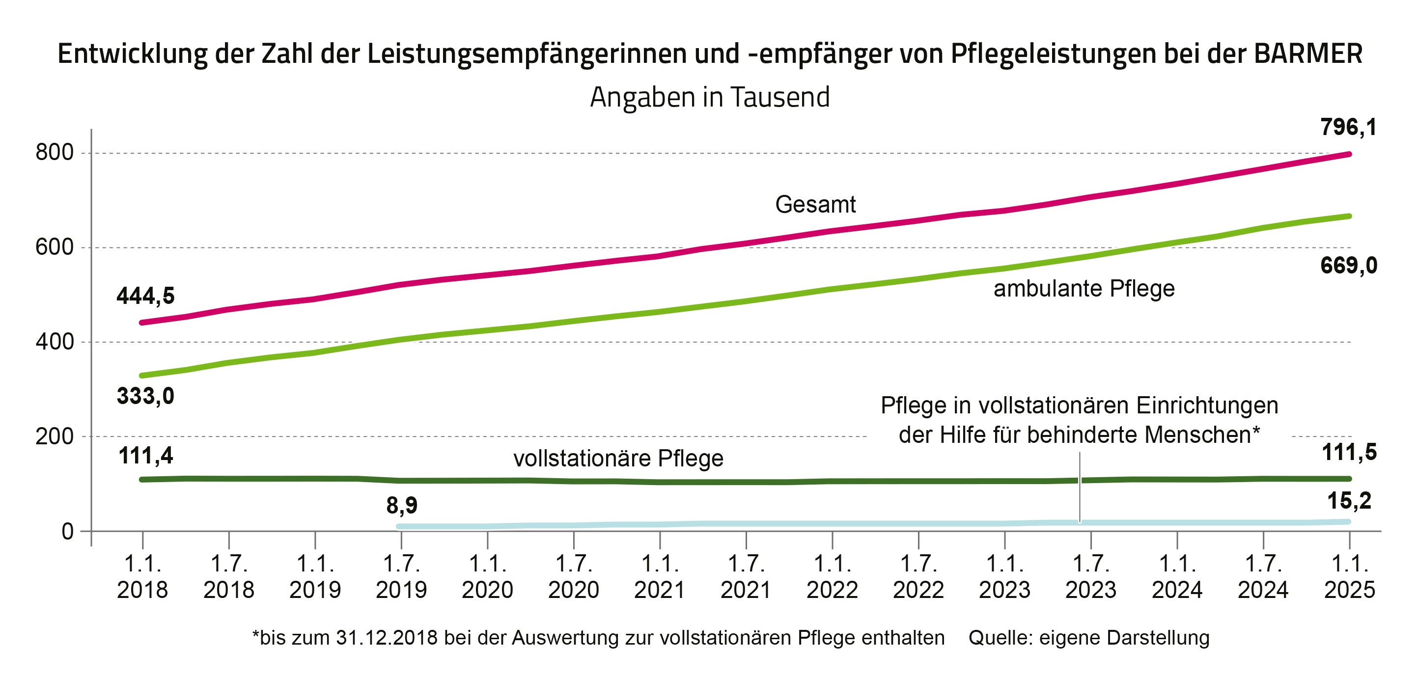 Die Zahl chronisch kranker und pflegebedürftiger Menschen steigt stetig an. Der Wunsch nach möglichst langem Verbleib in der eigenen Häuslichkeit führt zu einer großen Nachfrage nach Leistungen der ambulanten Pflege. So ist in den Jahren 2018 bis Ende 2024 die Zahl der bei der Barmer versicherten Pflegebedürftigen insgesamt um ca. 80 Prozent angestiegen, im Bereich der ambulanten Pflege war im selben Zeitraum eine Verdoppelung der Leistungsempfängerinnen und -empfänger zu verzeichnen.