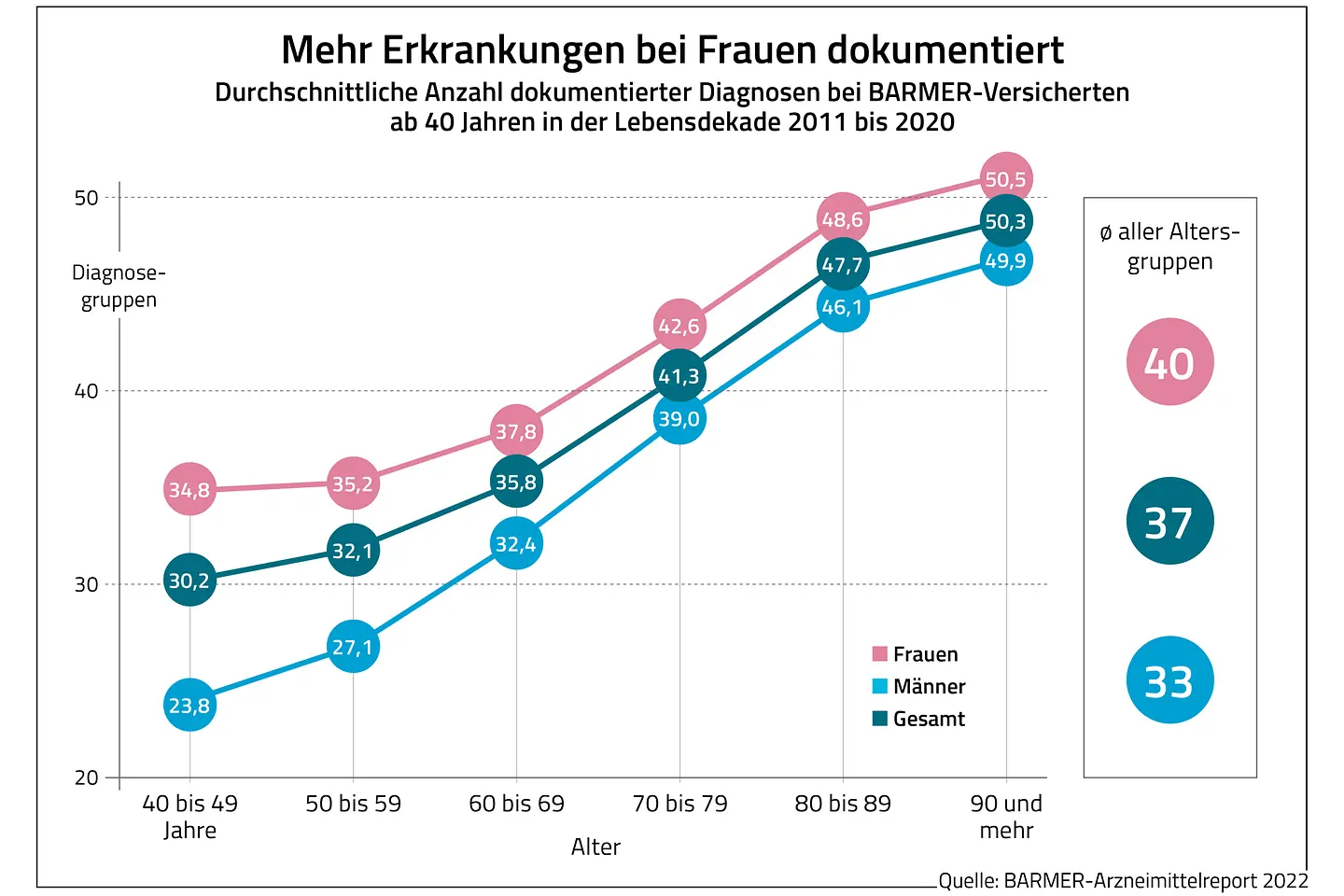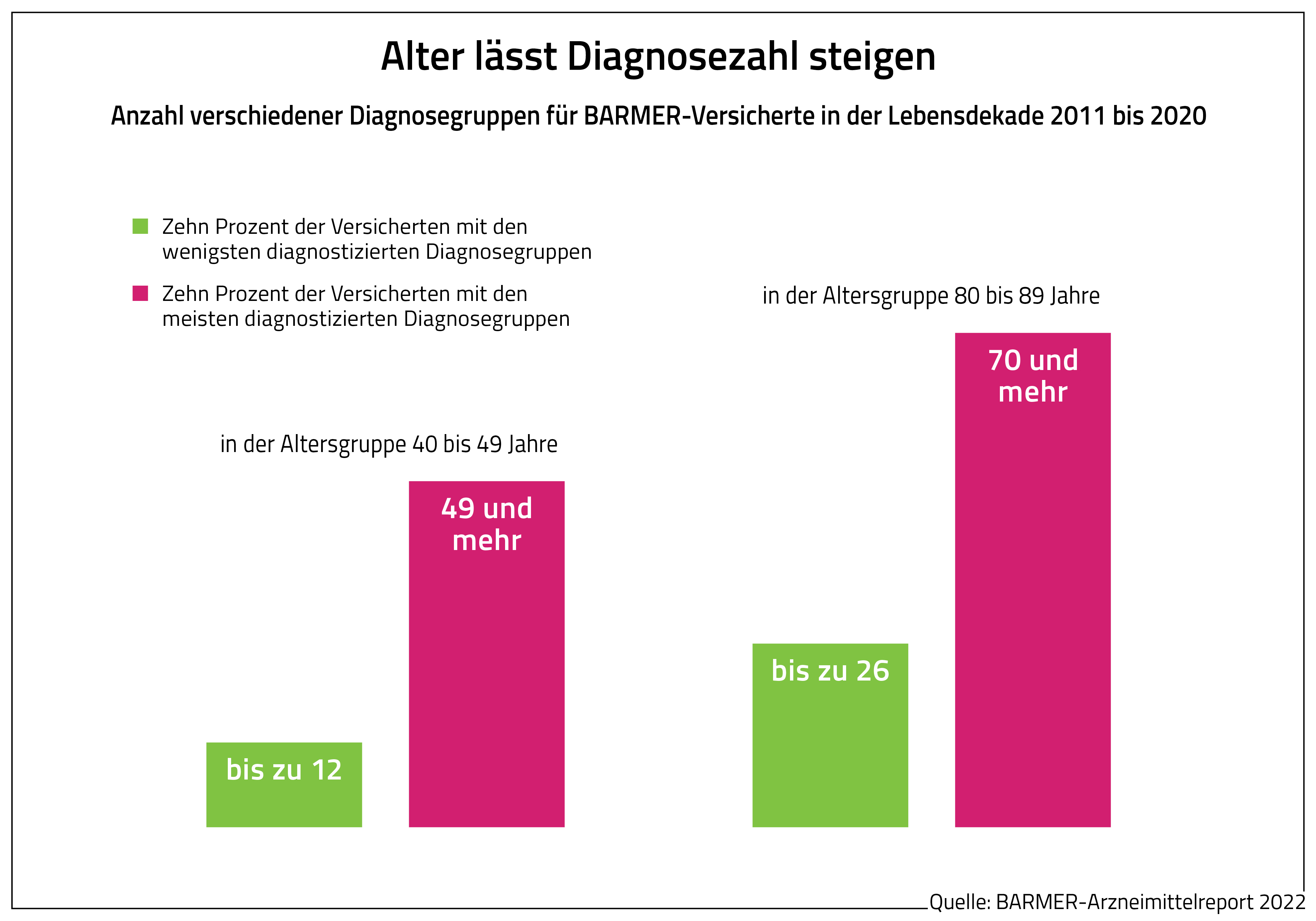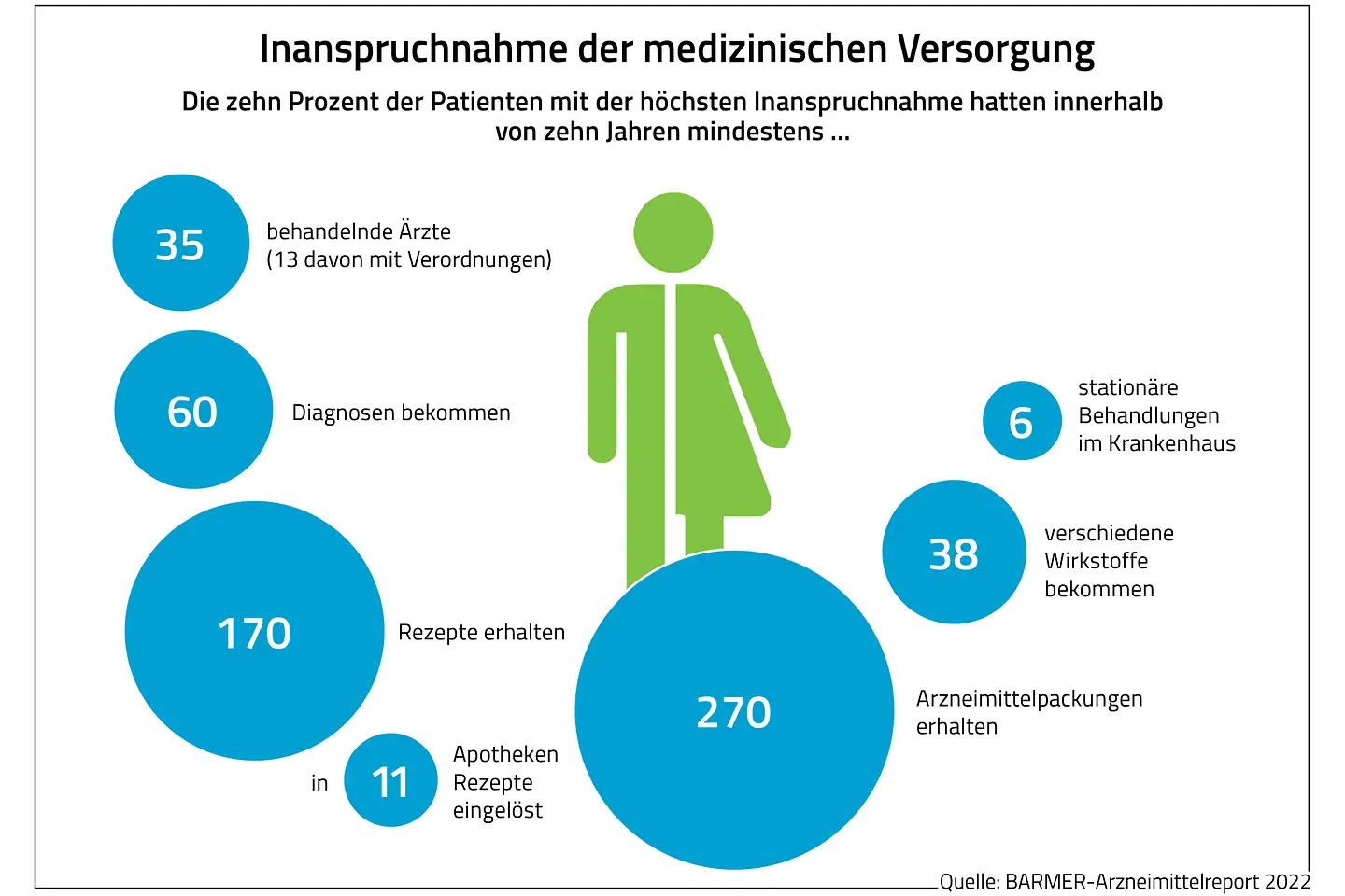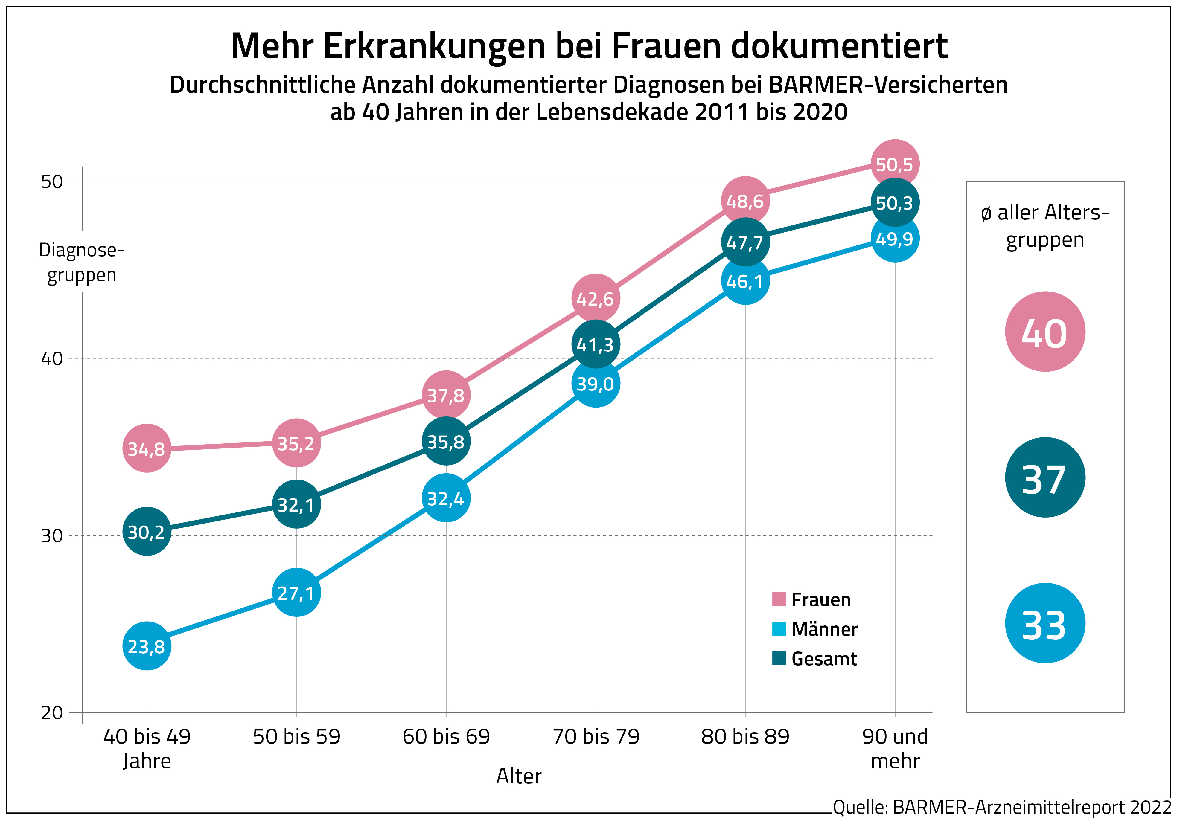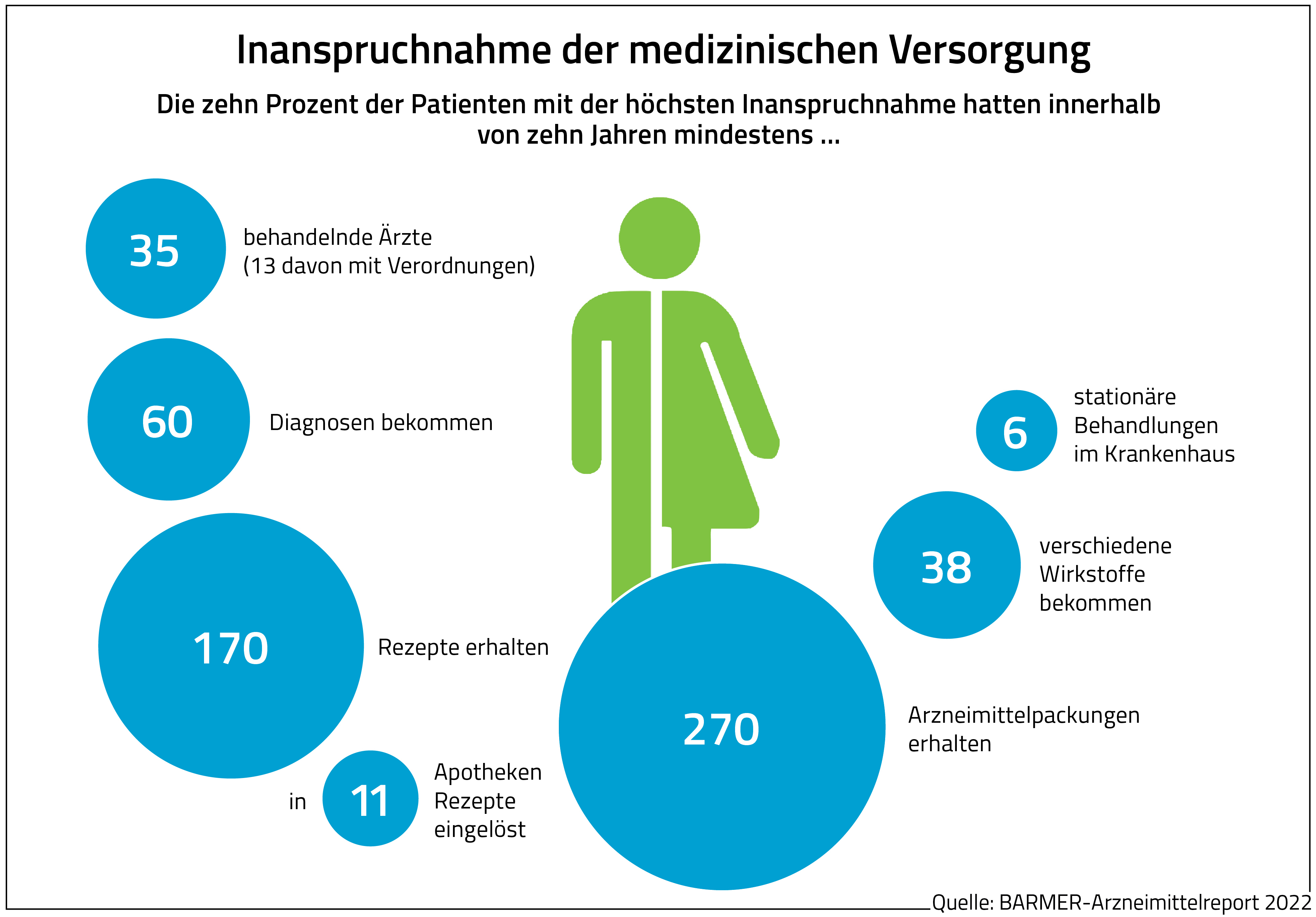 Berlin, 5. Oktober 2022 – Die Arzneimitteltherapie ist in Deutschland so komplex wie niemals zuvor. Ohne digitale Hilfe kann sie nicht ausreichend sicher sein. Das belegt der aktuelle Arzneimittelreport der Barmer, der heute in Berlin vorgestellt wurde. Er analysiert die Arzneimitteltherapie von Versicherten ab dem Alter von 40 Jahren für den Zeitraum von zehn Jahren. Demnach werden je Versicherten im Schnitt 37 Diagnosen innerhalb einer Lebensdekade dokumentiert. Patientinnen und Patienten bekommen etwa 20 Wirkstoffe verordnet, bei Menschen ab 80 Jahren sind es sogar eineinhalbmal so viele. In dieser Zeit besucht eine Patientin oder ein Patient im Schnitt rund 21 Arztpraxen. „Für Ärztinnen und Ärzte ist es kaum möglich, angesichts der Komplexität der Arzneimitteltherapie den Überblick zu behalten und Medikationsrisiken einzuschätzen. Um alles zu dokumentieren, ist eine digitale Unterstützung unabdingbar“, so Prof. Dr. med. Christoph Straub, Vorstandsvorsitzender der Barmer. Eine aussagekräftige und aktuelle Dokumentation sei für Millionen Patientinnen und Patienten überlebenswichtig.