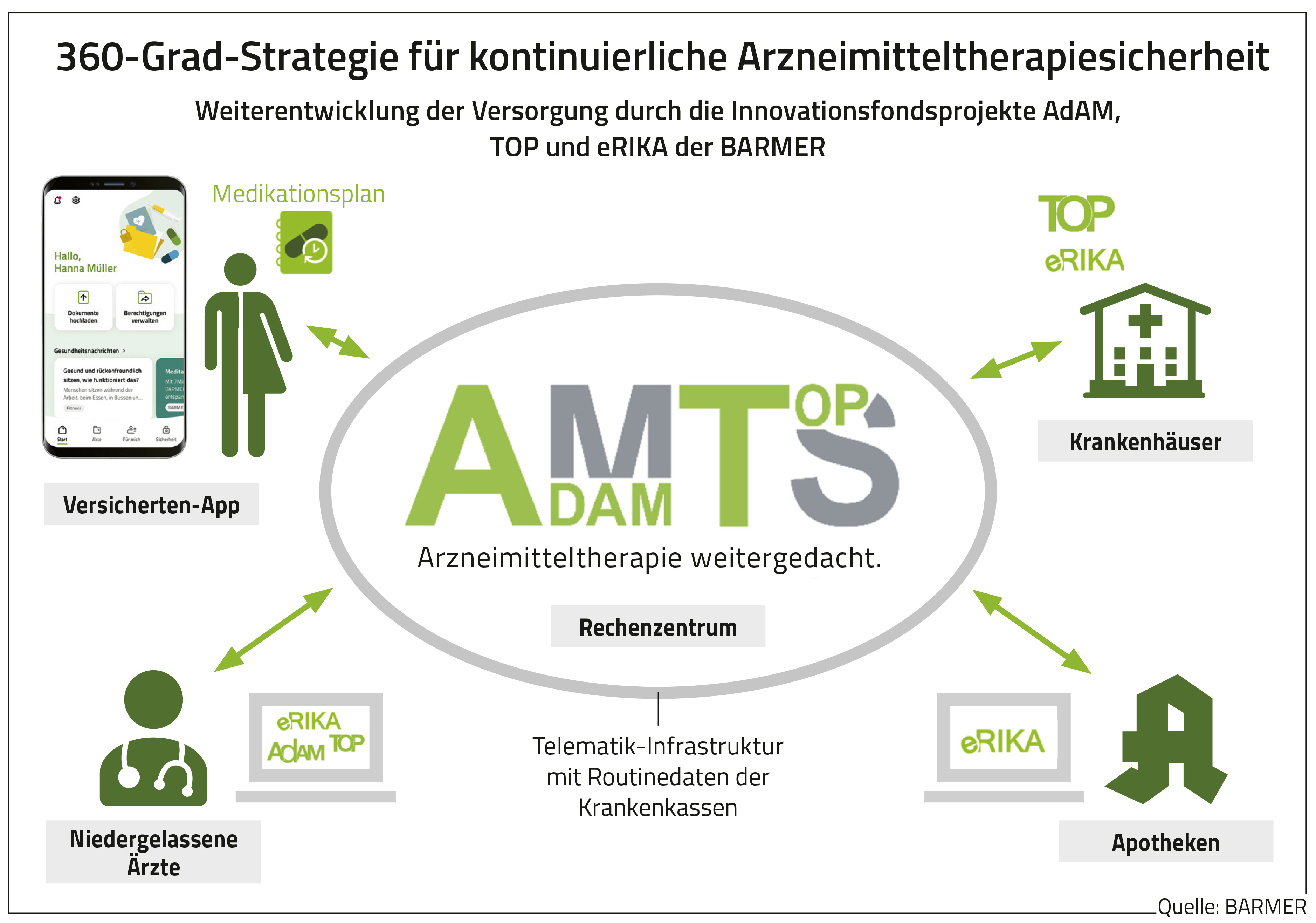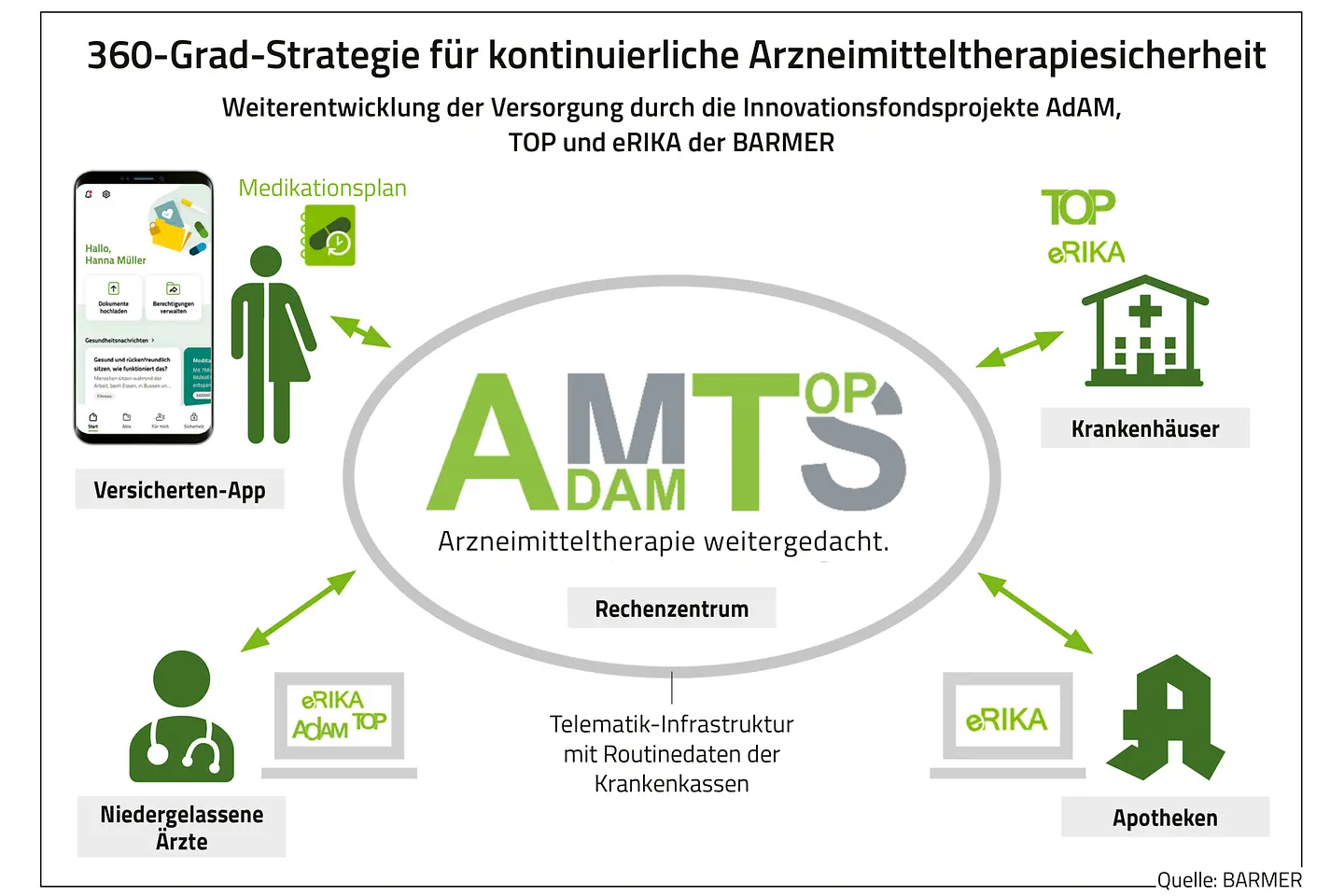 Mit dem Anfang Oktober gestarteten Projekt eRIKA ergänzt die BARMER die beiden Projekte AdAM und TOP. Das ermögliche einen kontinuierlichen, fehlertoleranten idealtypischen Prozess der Arzneimitteltherapie, der durchgängig die Arzneimitteltherapiesicherheit fördere. eRIKA nutze das elektronische Rezept und die bei der Abgabe von Arzneimitteln in der Apotheke entstehenden Daten für eine zentrale elektronische Dokumentation der Arzneimitteltherapie. Hier gleiche das Projekt AdAM und TOP. „Jeder Patient, dem ein Arzneimittel verordnet wird, hat immer einen aktuellen und vollständigen Medikationsplan, und das ohne Zusatzaufwand für Ärzte, Apotheker oder Patienten“, so Grandt.