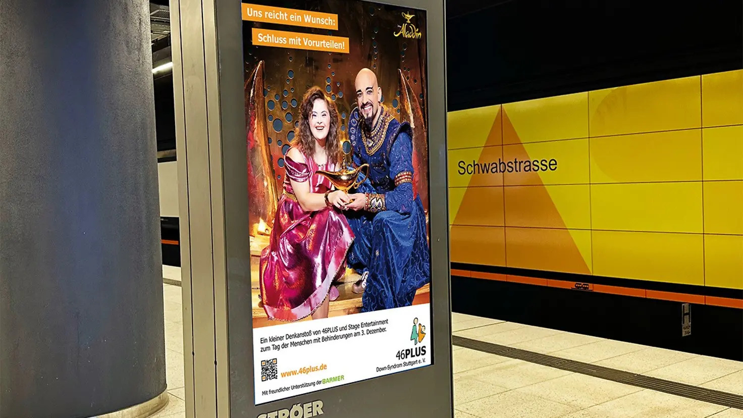 In dem Märchen 'Aladdin und die Wunderlampe' erfüllt der Flaschengeist Dschinni drei Wünsche. Der Stuttgarter Verein 46PLUS hat nur einen Wunsch. Nämlich den, dass Vorurteile gegenüber Menschen mit Downsyndrom abgebaut werden. Darauf macht der Verein zurzeit mit einer Plakataktion in Stuttgart aufmerksam. Die Barmer hat die Kampagne im Rahmen der Selbsthilfeförderung unterstützt. Petra Hauser (51) ist Gründungsmitglied von 46PLUS, Vereinsvorständin und Mutter eines 23-jährigen Sohnes mit Trisomie 21.
