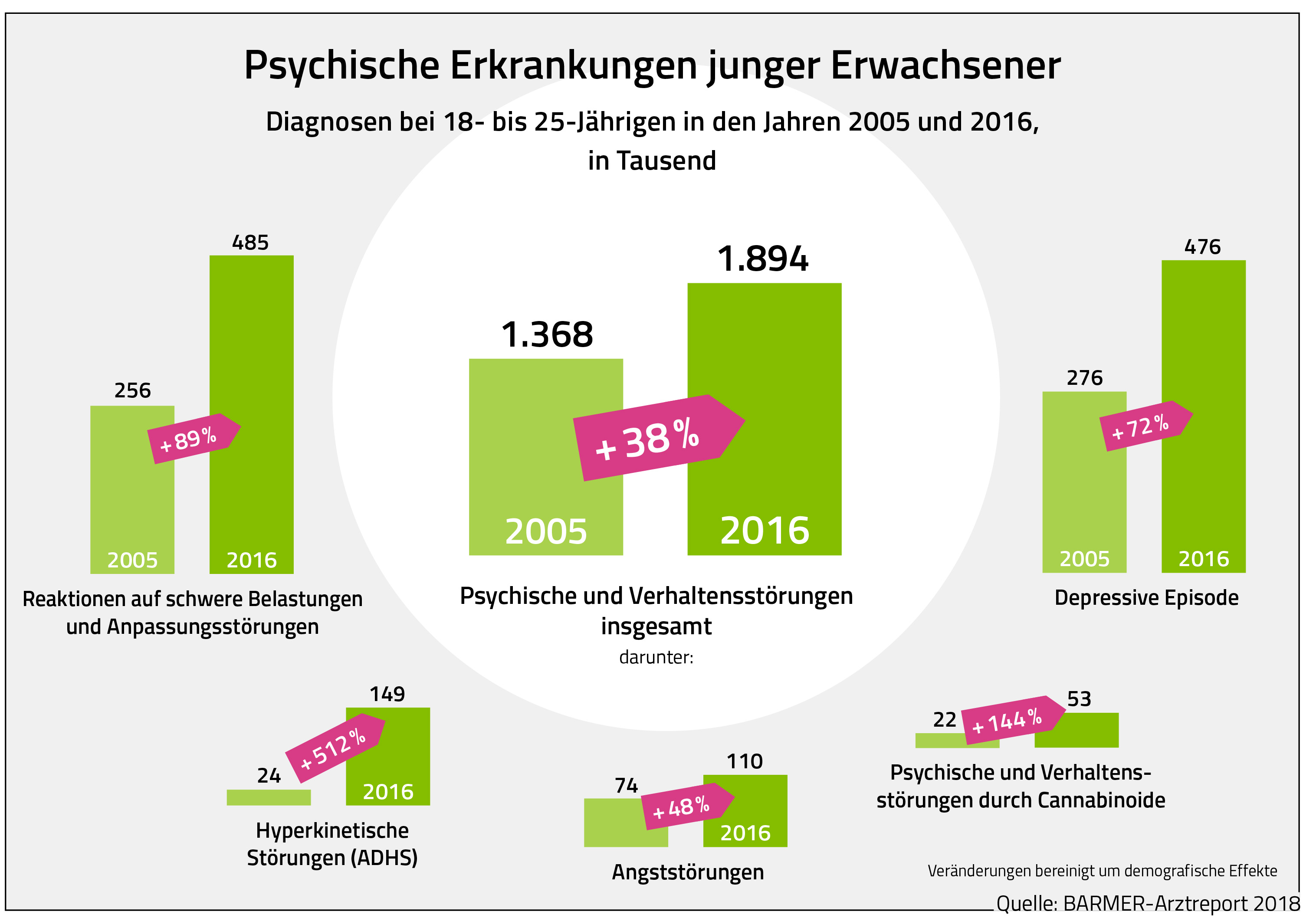 Für den Barmer-Arztreport wurde auch erhoben, wie viele junge Erwachsene in den baden-württembergischen Stadt- und Landkreisen von einer Depression betroffen sind. Demnach ist die Diagnoserate in allen Kreisen innerhalb von zehn Jahren gestiegen. In Mannheim wurde im Jahr 2016 bei 10,2 Prozent der 18- bis 25-Jährigen eine Depression ärztlich dokumentiert, zehn Jahre zuvor lag die Diagnoserate bei sieben Prozent. Der Landkreis Biberach weist die niedrigste Betroffenenquote aber ebenfalls einen Anstieg aus: von 3,8 Prozent im Jahr 2006 auf 5,1 Prozent im Jahr 2016.