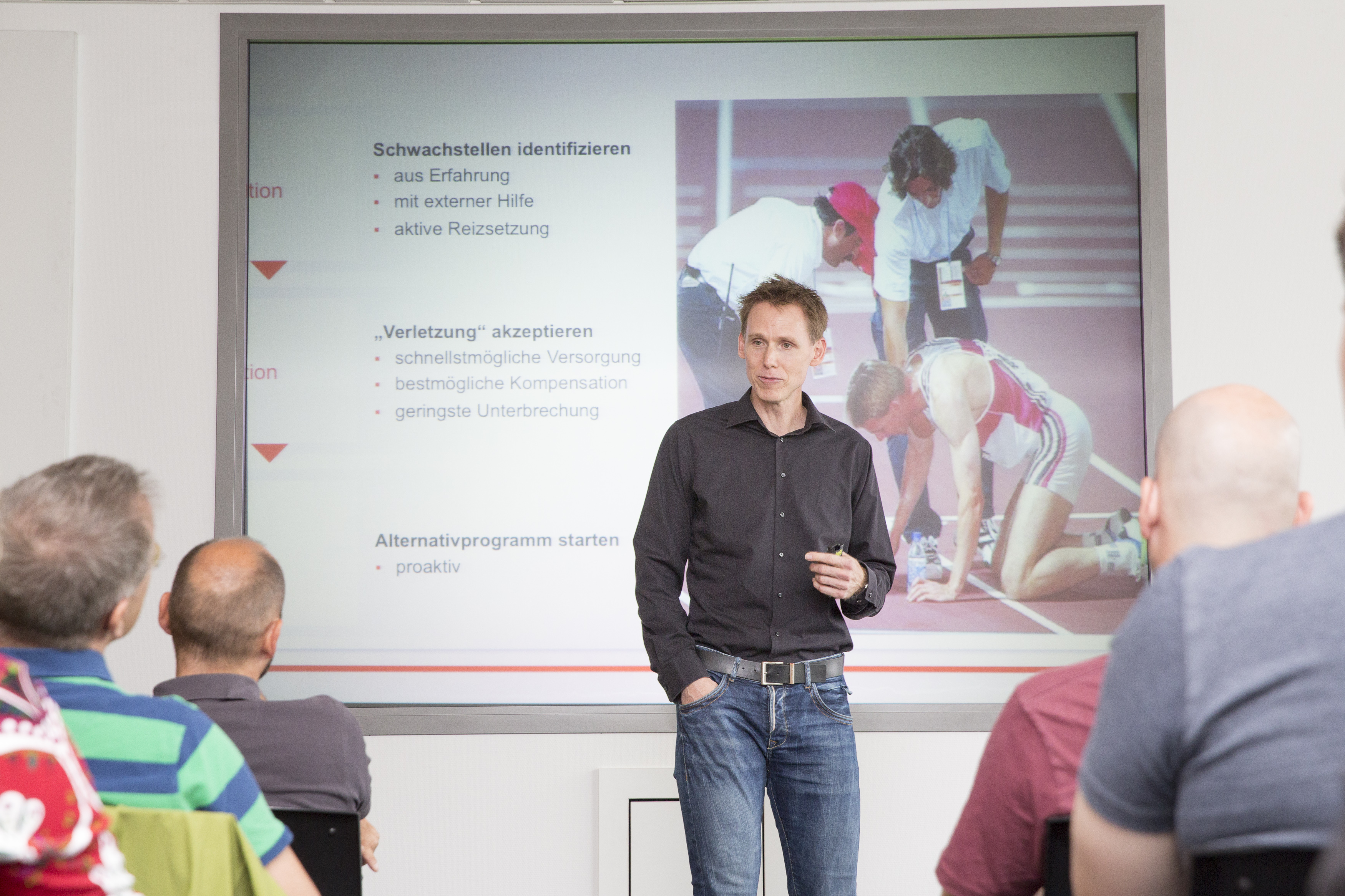 Heidelberg, 3. Juli 2017 - Zehnkampf-Olympiazweiter Frank Busemann hat am Samstag in Heidelberg mit Angestellten von Henkel trainiert. Anlass dafür war das Präventionsprojekt „Spitzensportler bewegen Mitarbeiter“, das die Krankenkasse Barmer ins Leben gerufen hat. In einem einstündigen Vortrag berichtete Busemann vor 40 Beschäftigten über seine Zeit als Profisportler, gab Motivationstipps und beantwortete Fragen. Danach folgten zwei 60-minütige Workouts.