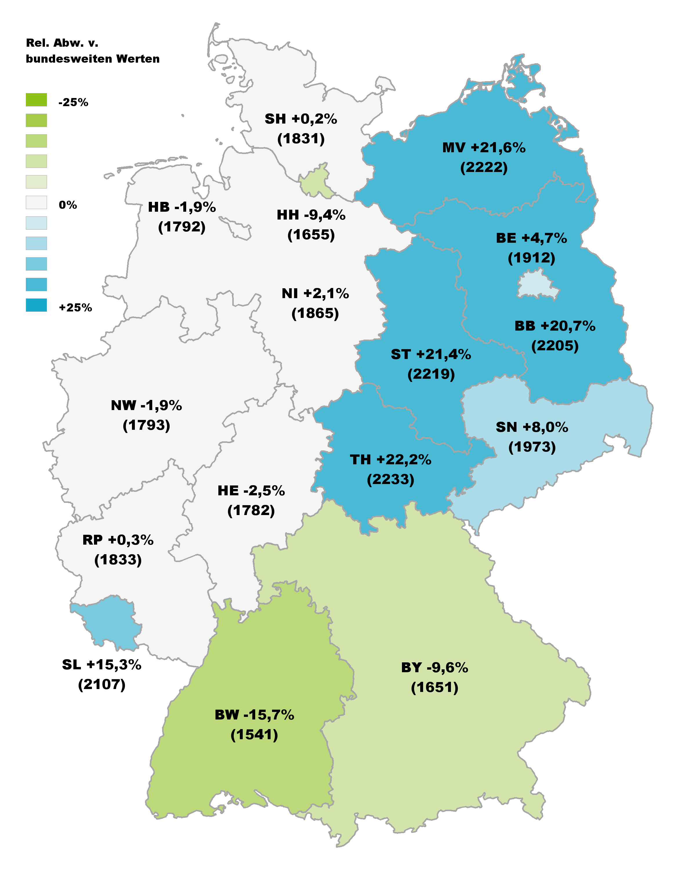 Stuttgart, 15. März 2019 – Die krankheitsbedingten Fehlzeiten sind in Baden-Württemberg im Jahresvergleich deutlich gestiegen, das geht aus aktuellen Auswertungen der Barmer hervor. Im Vergleich zum Vorjahr wurden mehr Krankheitsfälle registriert (+ 2,6 Prozent), ursächlich dafür war vor allem die starke Grippe- und Erkältungswelle Anfang des Jahres 2018. Laut Barmer fehlte jeder Baden-Württemberger im letzten Jahr 15,4 Tage krankheitsbedingt im Job. "Im Vergleich zum Jahr 2017 sind die Fehlzeiten in Baden-Württemberg um 3,7 Prozent oder vielmehr um 0,6 Tage pro Person gestiegen", ergänzt Barmer Landesgeschäftsführer Winfried Plötze. Der Krankenstand stieg um 2,4 Prozent auf 4,22 Prozent. Das heißt von 1.000 erwerbstätigen Baden-Württembergern waren täglich 42 krankgeschrieben. Bundesweit waren die Thüringer mit 22,3 Krankheitstagen pro Person am längsten arbeitsunfähig. Die Baden-Württemberger sind – wie immer – die gesündesten Deutschen (siehe Grafik).