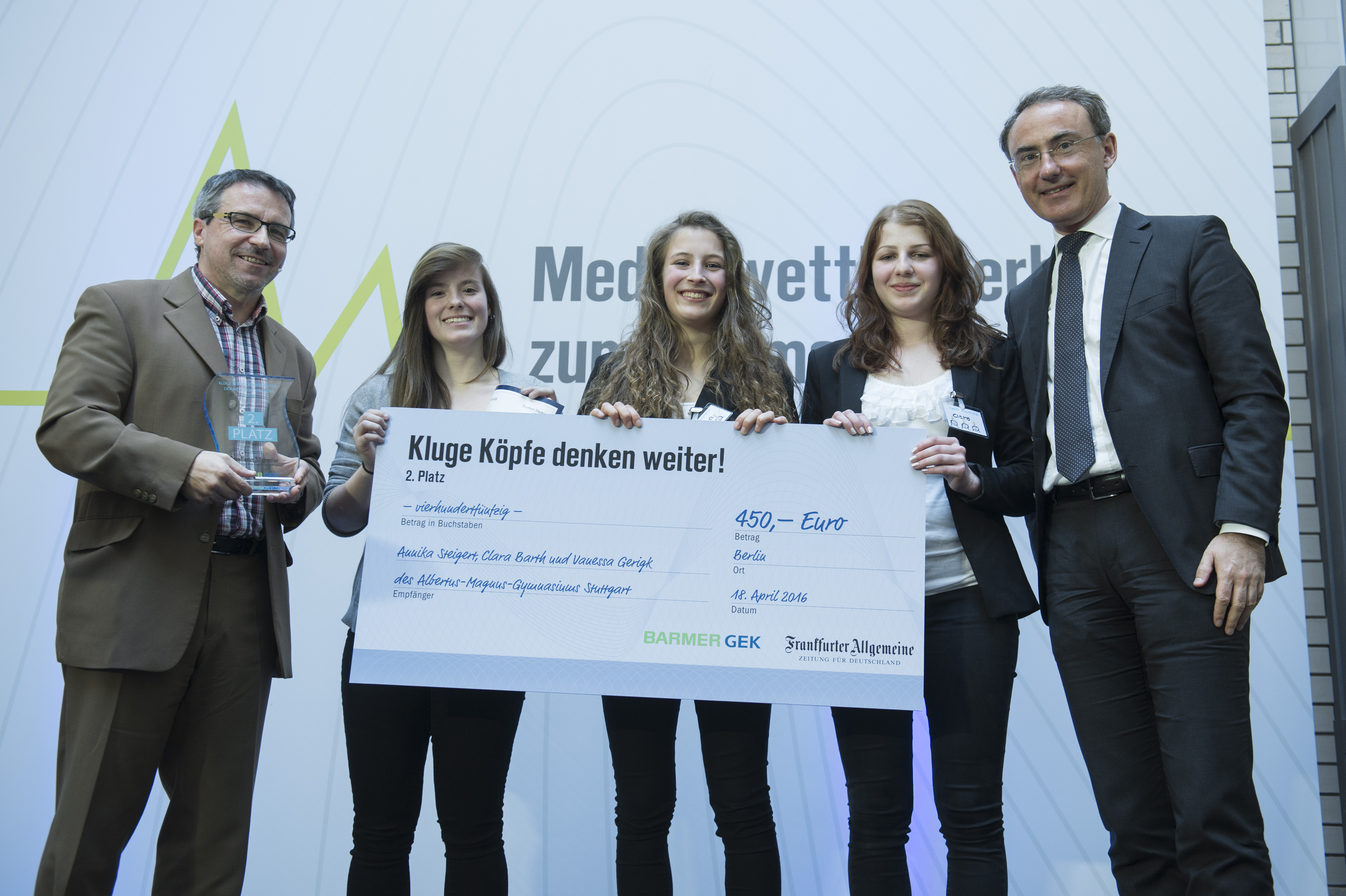 Berlin (19.04.2016) Wie lebe ich am gesündesten? Und wie sollte mein optimaler Tag aussehen? Diesen Fragen gingen Schüler des Albertus-Magnus-Gymnasiums aus Stuttgart bei der Entwicklung ihrer Website "Health Awareness – Essen, bewegen, ruh’n – dabei dem Körper Gutes tun!" nach. Für ihr Projekt wurden Annika Steigert, Clara Barth, Vanessa Gerigk und Lehrerin Gabriele Schwelling am Montag auf der Preisverleihung des Medienwettbewerbs "Kluge Köpfe denken weiter" der Barmer GEK und der Frankfurter Allgemeinen Zeitung (F.A.Z.) in Berlin mit dem 2. Preis in der Kategorie "Schüler" ausgezeichnet.