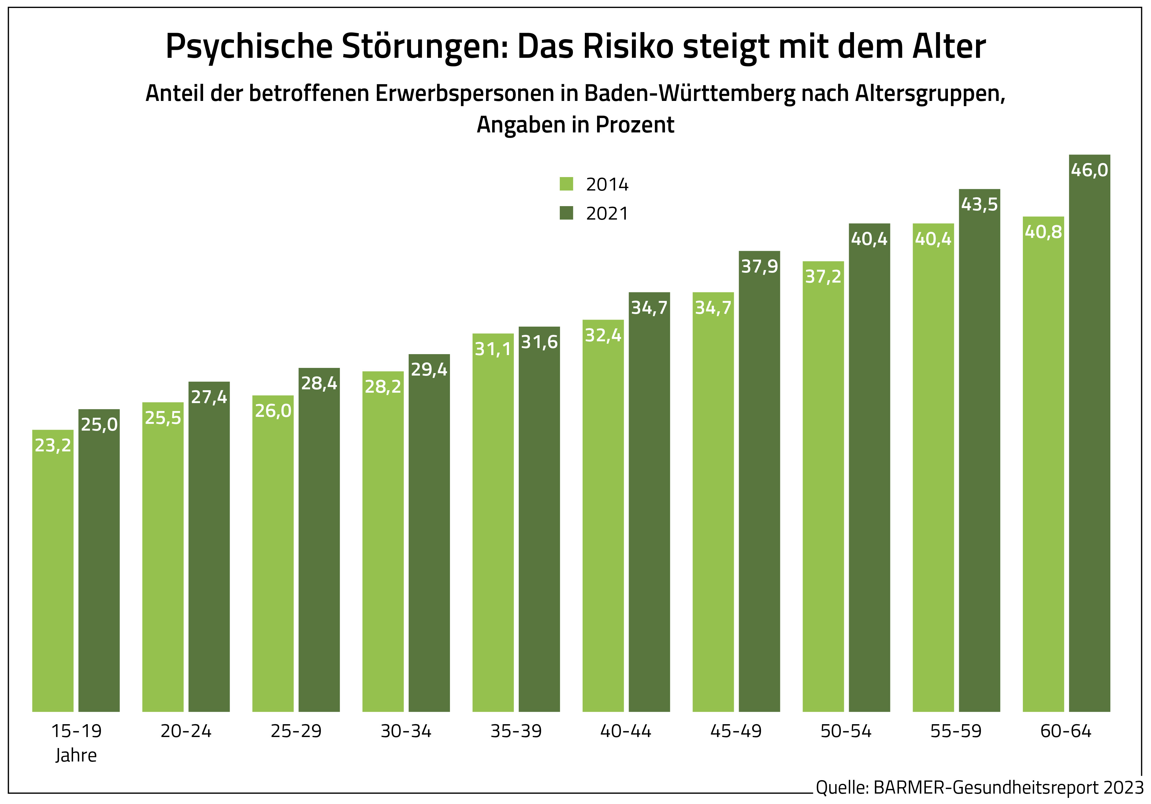 Tatsächlich ist die Depression die psychische Erkrankung, die laut Barmer-Gesundheitsreport am häufigsten festgestellt wurde. Bei fast elf Prozent der baden-württembergischen Erwerbspersonen sei sie im Jahr 2021 erstmals diagnostiziert worden. Mehr als fünf Prozent litten unter einem Rezidiv, also einer wiederkehrenden Depression. Vor allem Ältere seien betroffen. "Eine Depression korreliert mit Umständen, die mit einem höheren Alter einhergehen. Etwa Krankheiten oder Todesfällen. Außerdem wird die berufliche Belastung im Alter stärker wahrgenommen, das kann auch eine Rolle spielen", sagt Barmer-Landeschef Winfried Plötze. Zudem würden die psychischen Störungen das Renteneintrittsalter senken. Bei der Deutschen Rentenversicherung Baden-Württemberg seien im letzten Jahr rund 36 Prozent der Anträge auf eine Erwerbsminderungsrente mit einer psychischen Erkrankung begründet worden. Bundesweit liege die Quote bei 42,3 Prozent. Dadurch würden die Unternehmen zusätzlich Arbeitskräfte verlieren, die ihnen schon jetzt fehlten.
