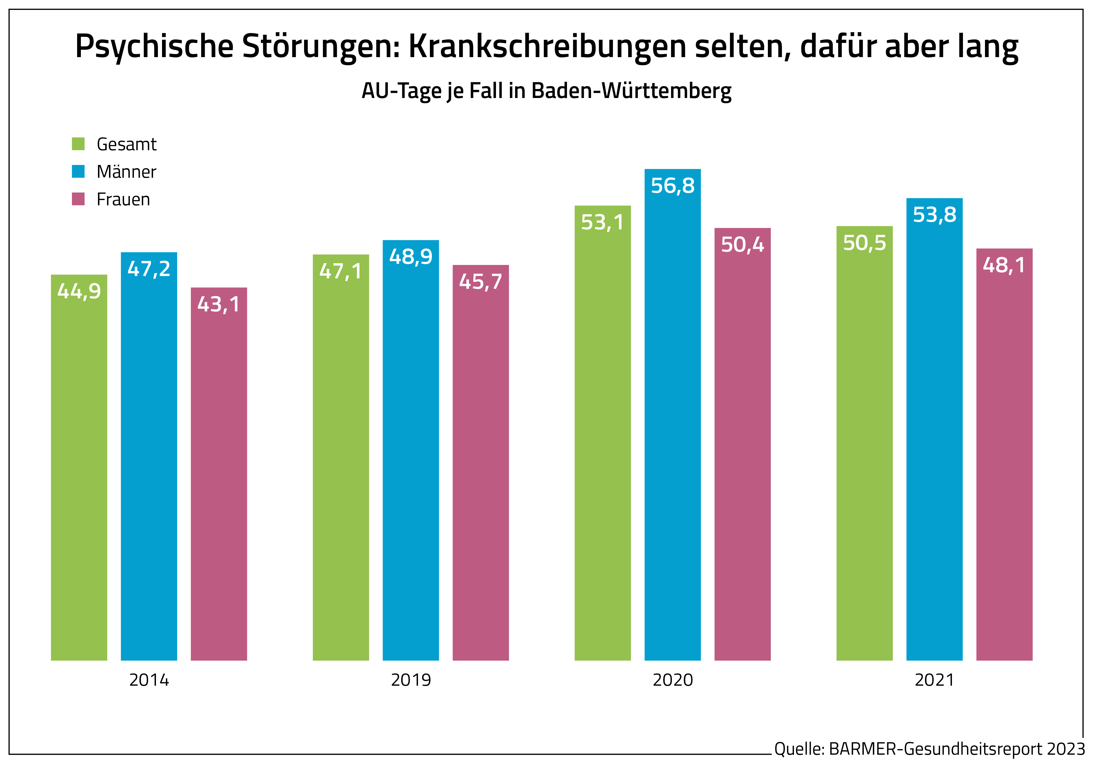 Für den Barmer-Gesundheitsreport 2023 wurden die Arbeitsunfähigkeitsdaten von bei der Barmer versicherten Erwerbspersonen im Alter von 15 bis 64 Jahren ausgewertet. Zu den Erwerbspersonen zählen sozialversicherungspflichtig Beschäftigte, freiwillig versicherte Selbstständige mit Anspruch auf Krankengeld und Bezieher von Arbeitslosengeld 1, die ebenfalls einen Anspruch auf Krankengeld haben. In diese Analyse sind die Arbeitsunfähigkeitsdaten von bundesweit 3,7 Mio. Barmer-Versicherten eingeflossen. Darunter sind rund 336.444 Erwerbspersonen aus Baden-Württemberg im Jahr 2021. Die Daten wurden nach Alter und Geschlecht standardisiert. Zusätzlich wurden ambulante und stationäre Diagnosen der Barmer-Versicherten in den Jahren 2014 bis 2021 berücksichtigt.