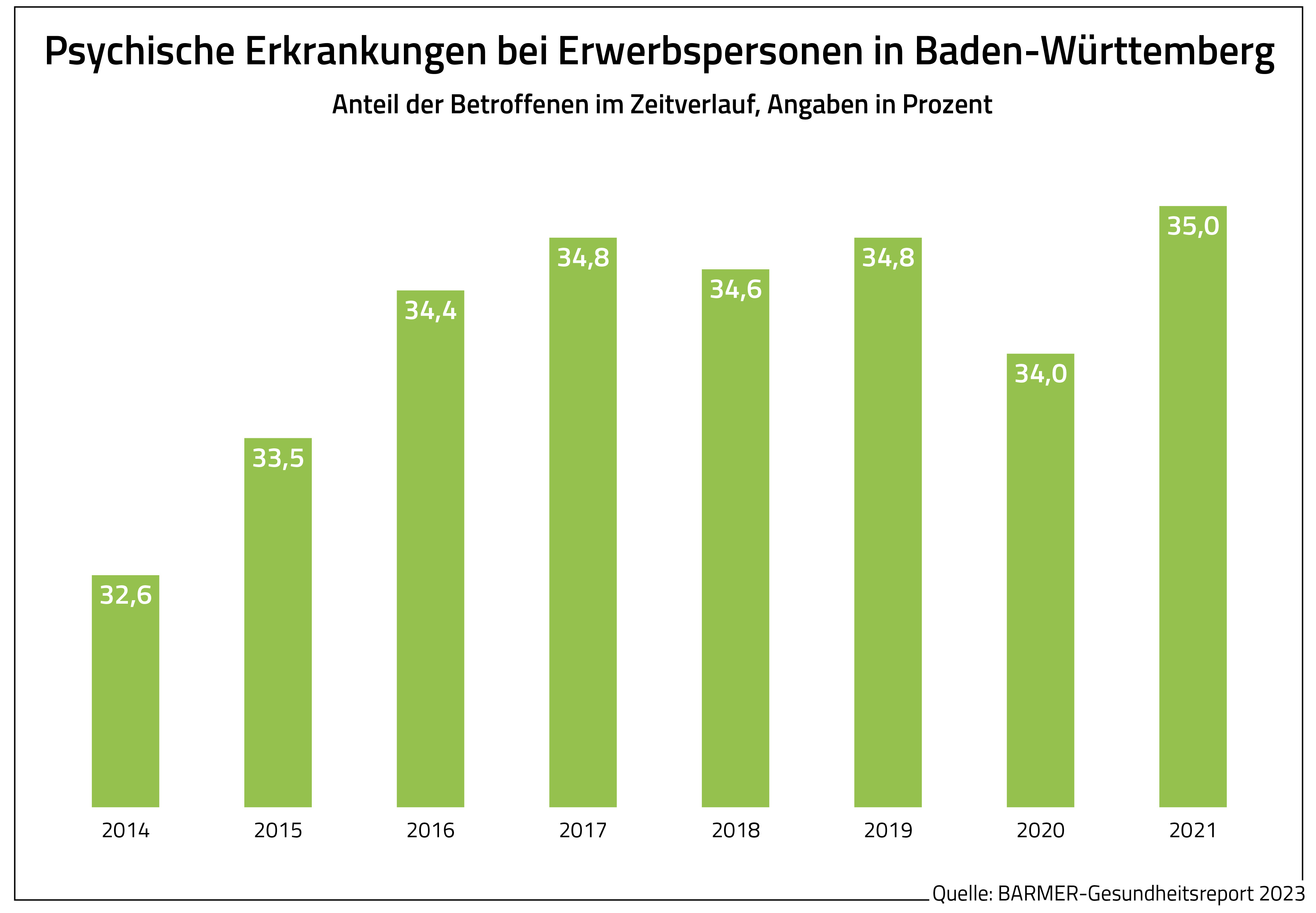 Stuttgart, 29. November 2023 – 35 Prozent und damit mehr als jede dritte Erwerbsperson aus Baden-Württemberg war im Jahr 2021 von einer psychischen Erkrankung betroffen. Das geht aus dem aktuellen Barmer-Gesundheitsreport hervor.