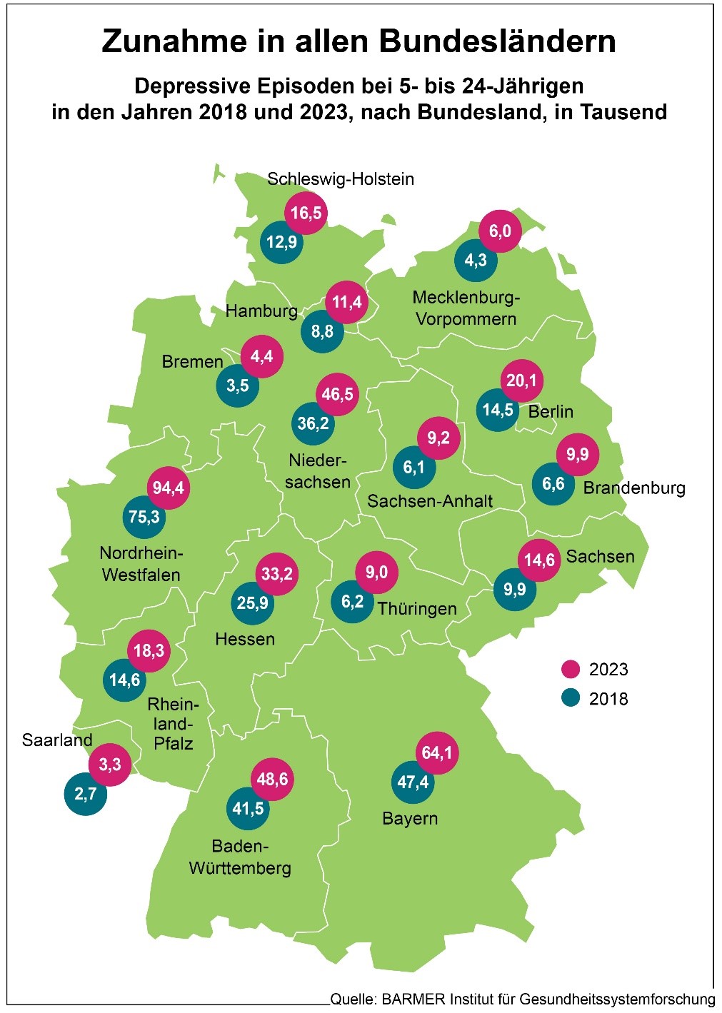 Die Zahl der jungen Menschen mit Depressionsdiagnose ist laut der BARMER-Analyse in allen Bundesländern gestiegen. Den größten Anstieg verzeichnet Sachsen-Anhalt mit einem Plus von 51 Prozent. Baden-Württemberg ist das Land mit der geringsten Steigerungsrate. Ein Grund zur Entwarnung sei das laut Barmer-Landeschef Plötze aber nicht. Denn die Diagnoserate würde auch hierzulande ständig steigen. Es sei eine gesamtgesellschaftliche Aufgabe, diesem Trend entgegenzuwirken.