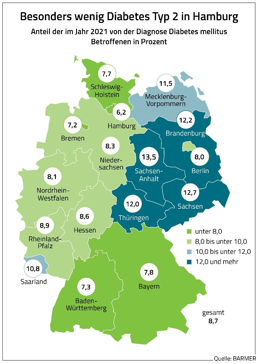 Lediglich in Hamburg und Bremen gibt es weniger Zuckerkranke. Dort leiden 6,2 Prozent, beziehungsweise 7,2 Prozent der Einwohnerinnen und Einwohner an Diabetes Typ 2. Die höchste Rate hat Sachsen-Anhalt mit 13,5 Prozent der Einwohner zu beklagen. Der Wert liegt rund 55 Prozent über dem Bundesschnitt. "Die regionalen Schwankungen bei der Zuckerkrankheit sind nicht allein auf die unterschiedlichen Alters- oder Geschlechtsstrukturen zurückzuführen, denn die Krankheit hat viele Ursachen wie etwa ungesunde Ernährung und Bewegungsmangel. Deshalb ist es wichtig, dass die Nationale Diabetes-Strategie der Vorgängerregierung weiter ausgestaltet und umgesetzt wird", fordert Winfried Plötze, Landesgeschäftsführer der Barmer in Baden-Württemberg. Bei Diabetes mellitus Typ 2 lasse sich mit Prävention eine Menge erreichen. Mit geänderten Ess- und Bewegungsgewohnheiten sei die Krankheit vermeidbar oder lasse sich zumindest im Verlauf abschwächen oder hinauszögern.